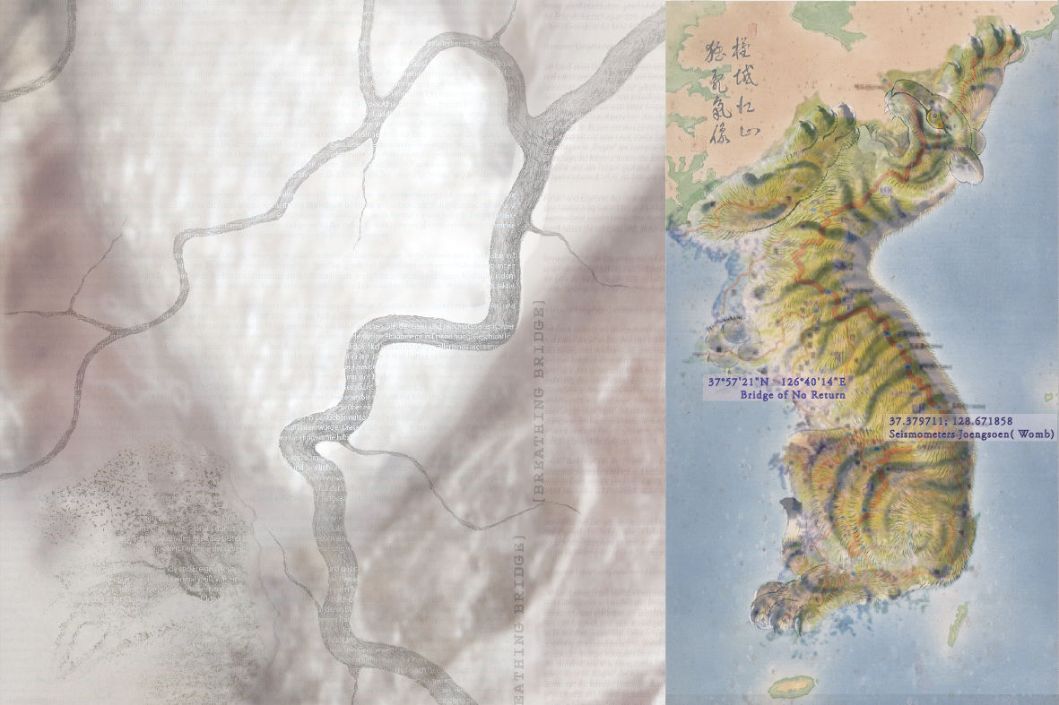 Mona Kakanj (*Teheran, Iran) studierte zunächste von 2007 bis 2011 Bildende Künste an der Alanus Hochschule in Alfter. 2012 bis 2015 Studium an der KHM. Sie wohnt und arbeitet in Köln. Mona Kakanjs Werke beinhalten eine verfremdende Perspektive. Durch das Hinterfragen von Normen und Konzepten und durch deren Positionierung außerhalb eines konventionellen Kontextes setzt sie sich mit den tradierten Wertesystemen auseinander. Ihre Arbeiten reflektieren Themen wie Wahrnehmung, Gewalt, Zugehörigkeit sowie persönliche und kulturelle IdentitätSoyoung Park „su:um, dari“ (Atmung, Brücke), Sound-Installation Wenn die Blumen trotz des kalten Windes von Norden Frühlingssprossen hervorbringen, driften die tektonischen Platten durch die Bewegung der Energie, die in verschiedene Richtungen wirkt, auseinander. Die Veränderung des Kontinents hat begonnen. In dieser Welt voll von Bewegung habe ich ein Paar Karpfen geschenkt bekommen. Aus Neugier auf die Botschaft schneide ich den Bauch der Karpfen auf. Das Gebirge „Baekdudaegan“, das aus einer riesigen Felsbrücke besteht. Das „Baekdu“ Gebirge, das sich hoch nach oben streckt, als ob es den Himmel erreichen wolle und die 12 Venen, die gleichzeitig tief nach unten sinken, als ob sie dem Ozean begegnen wollen. Vielleicht verbirgt sich darin ein Geheimnis, etwa wie man der universellen Energie begegnen kann. Als ob man verzaubert ist, bleibt man an einem Ort stehen, auf demselben Längen- und Höhengrad. Als ob man mit dem Kontinent, dem Ozean und der Luft kommuniziert und das Erzählte an einen Stern in einer fernen Galaxie übermittle. Wer ist der Übermittler dieser Geschichte? Ich vermute, es ist der historische „su:um“ (Atem), der im „Baekdu“ Gebirge verborgen bleibt.