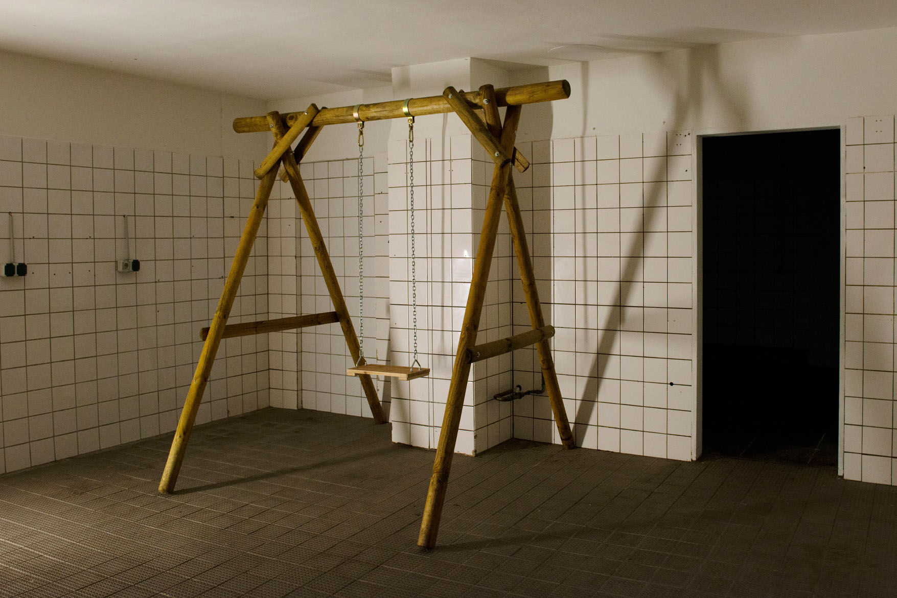 Mona Kakanj SeeSaw II, Installation/ Intervention, 2016 Die Installation SeeSaw II basiert auf einer Freizeitapparatur: eine Schaukel. Die Schaukel wurde aus ihrem ursprünglichem Zusammenhang – dem Kinderspielplatz – gelöst, und in einer unzweckmäßigen Position platziert, so dass nicht nur ihre primäre Funktion, sondern auch ihre in Beziehungstehenden Assoziationen missachtet werden.