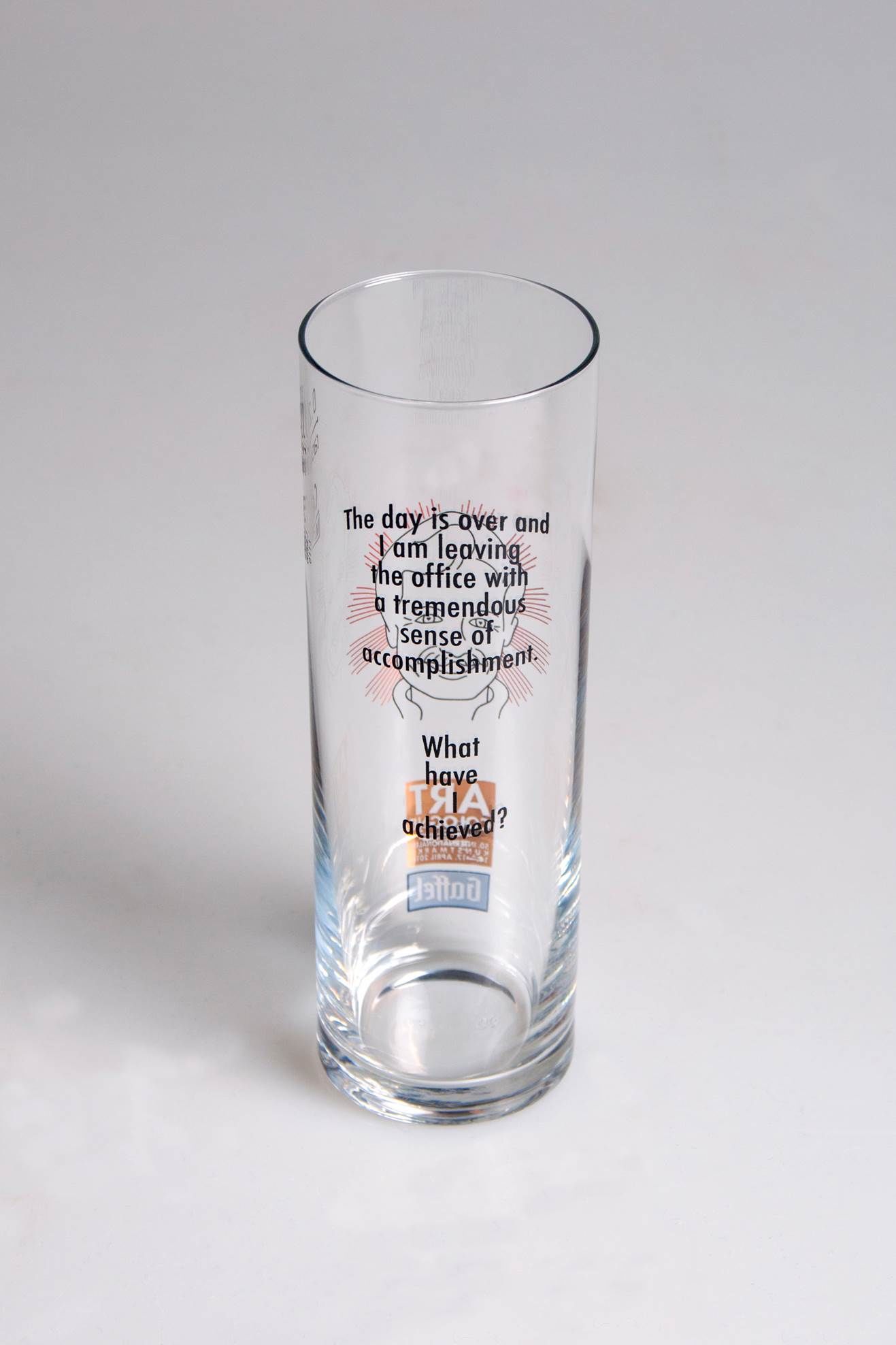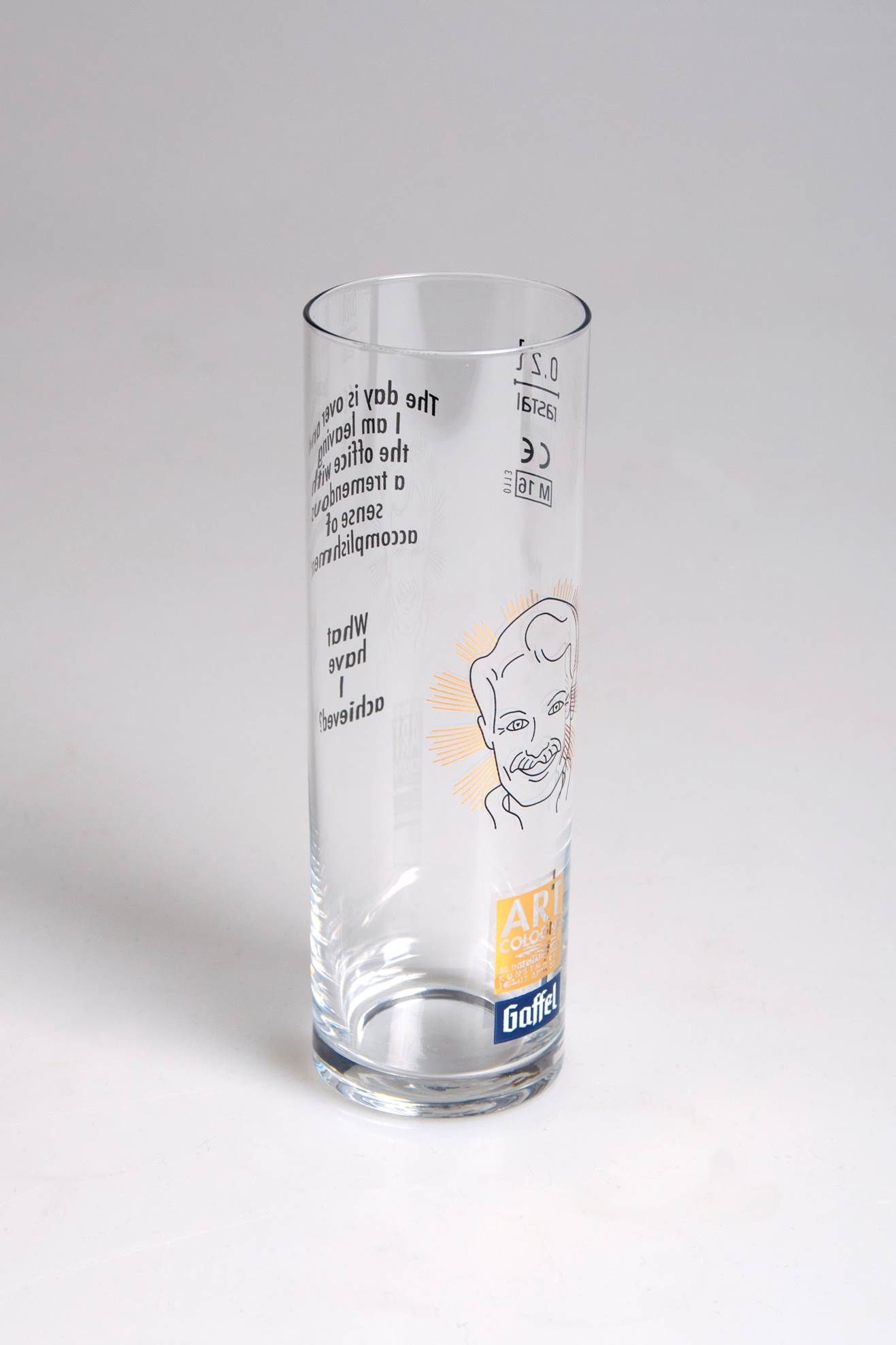 Andy Kassiers Gestaltungsentwurf für die Gaffel Kölsch-Stange zur 50. ART COLOGNE greift einen Leitspruch in Selbstmanagement-Ratgebern auf: "The day is over and I am leaving the office with a tremendous sense of accomplishment. What have I achieved?"