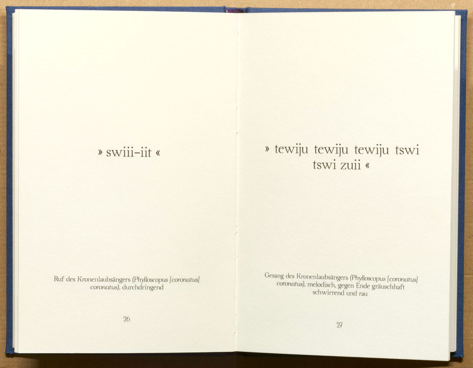 In Sophia Bauers künstlerischer Praxis (geb. 1987 in Ebersberg, seit 2013 Studium an der KHM) spielen Übersetzungsprozesse und Verschiebungen eine zentrale Rolle. Ihr Buchprojekt „26 Vogelstimmen“, das im Frühjahr 2016 im Rahmen des Projekts „Kunst an Kölner Litfaßsäulen“ auf rund 100 Säulen im gesamten Stadtraum zu sehen war, trug transkribiert in Lautsprache die vielgestaltigen Stimmen von ausgeflogenen Vogelarten wieder in den Stadtraum zurück.