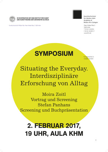 'The symposium Situating the Everyday. Interdisciplinary Inquiries into the Quotidian' is scheduled for February 2017 at the Laboratory of Art and Research at the University of Cologne. The symposium is planned as a second part of 'Talking about Seeing. Observational Practices and the Everyday', a panel discussion and symposium which took place at Parsons, The New School, in December with contributions by Aatish Bhatia, Meghan O’Hara & James Merle Thomas, Martha Rosler und Pacho Velez among others. (http://www.observationalpractices.org).