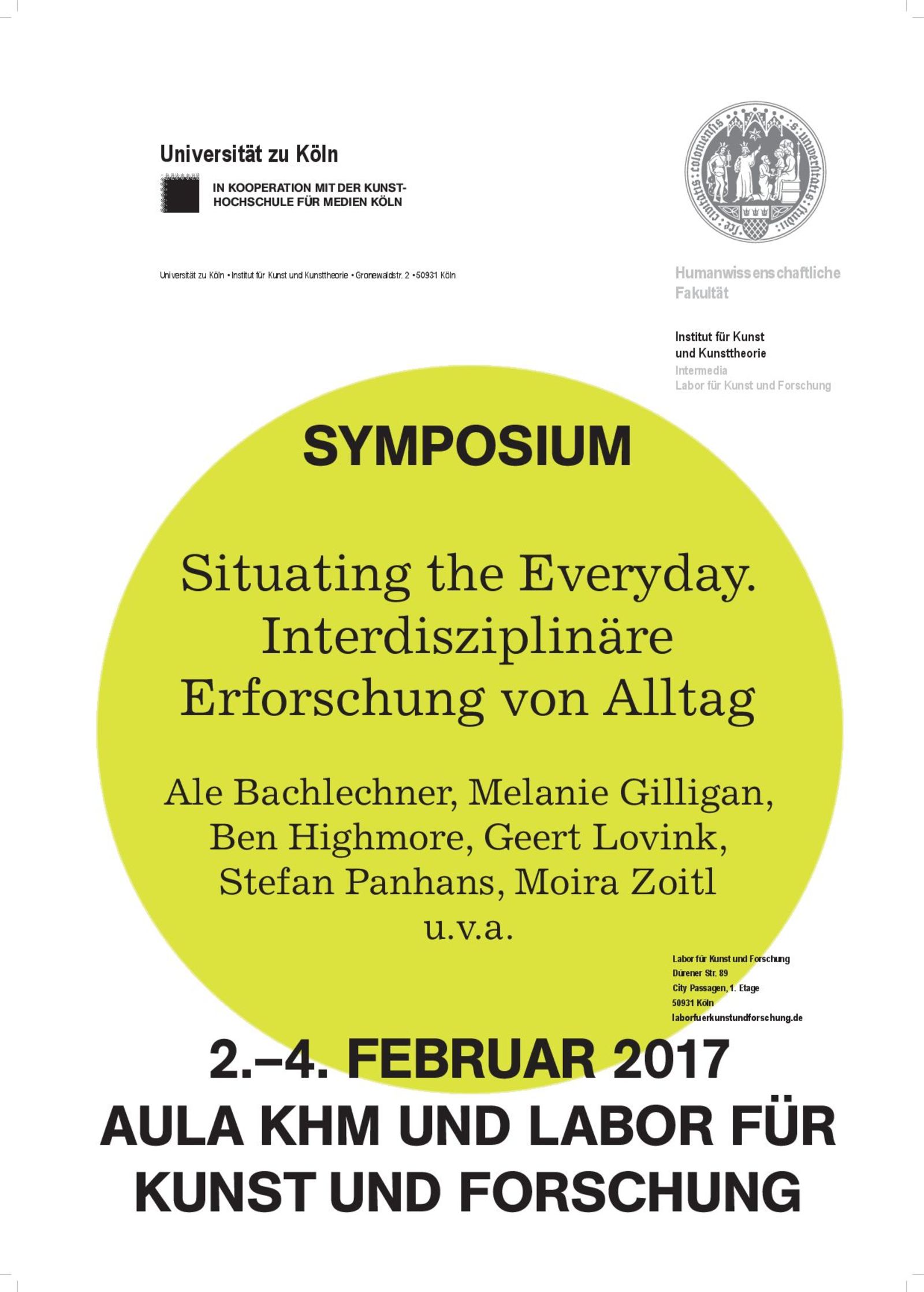 'The symposium Situating the Everyday. Interdisciplinary Inquiries into the Quotidian' is scheduled for February 2017 at the Laboratory of Art and Research at the University of Cologne. The symposium is planned as a second part of 'Talking about Seeing. Observational Practices and the Everyday', a panel discussion and symposium which took place at Parsons, The New School, in December with contributions by Aatish Bhatia, Meghan O’Hara & James Merle Thomas, Martha Rosler und Pacho Velez among others. (http://www.observationalpractices.org).