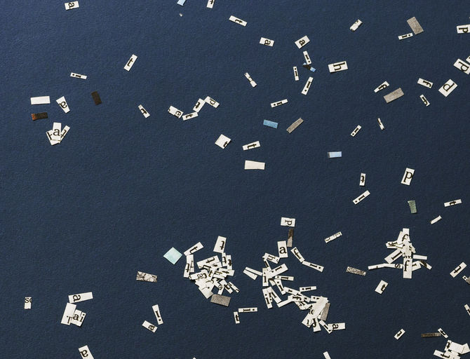 Seit 2013 arbeitet Elzel in ihren Fotografien wiederholt mit Anordnungen von aus Zeitungsseiten ausgeschnittenen Buchstaben, dabei entstehen in der Tradition der Collage stillebenartige Arrangements. Bestehende Textformationen werden in einem paradox-akribischen Akt bis zur Unlesbarkeit in Einzelbuchstaben und Wortfragmente zerlegt, schließlich neu akkumuliert und zu einem scheinbar zufällig anmutenden Bild rekomponiert. In der für die Ausstellung in GLASMOOG neu entstandenen siebenteiligen Fotoserie „SUNDAY, JUNE 26 – SATURDAY, JULY 2“ betonen die Strahlen von einfallendem Sonnenlicht den flüchtigen Moment des fotografischen Augenblicks und verwandeln die abstrakt-grafischen Anhäufungen von Buchstaben in wandelbare Archipele, deren textlichen Bezüge in der Betrachtung immer wieder neu entstehen.