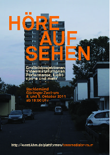 Am 8.und 9. Oktober 2011 präsentieren Vera Drebusch, Minjung Cho, Philipp Imlau, Sunjha Kim, Lena Ditte Nissen, So Young Park, Julia und Christian Stefanovici und Katharina Urbaniak ihre Arbeiten im öffentlichen und privaten Raum. Sie machen Bekanntschaften, laden zum Konzert ins Vogelwäldchen, setzen Lichter auf Hochhäuser und Kinder in Hochsitze, lassen Geysire auf Betonfassaden steigen und finden die Geister im Stadtwald. Projektbegleitung: Transmedialer Raum der Kunsthochschule für Medien Köln, Profs. Hörner/Antlfinger und Echo Ho.