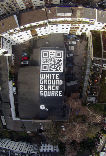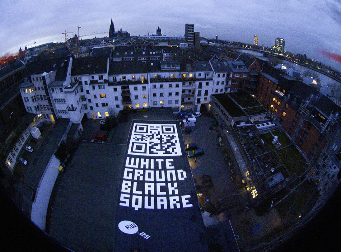 REMOTEWORDS ‚hackte‘ virtuelle Globen mit Klaus Staecks Botschaft OFF LIMITS FOR GOOGLE, das Kunstimuuseum in Tallin mit CLICK HERE >, oder gar in Zusammenarbeit mit Peter Weibel den gesamten realen Erdball über fünf Kontinente gestreckt mit ONE EARTH UNITES MANY WORLDS. Und 2015 wurde zum 25-jährigen Bestehen der Kunsthochschule für Medien Köln ein Hausdach am Filzengraben 18-24 die 25. Station des Langzeitprojekts und mit dem Titel WHITE GROUND BLACK SQUARE (RW.25) bemalt und als QR-Code dargestellt – in Anspielung auf das scharf-unscharfe quadratische KHM-Logo und für immer lesbar aus der Google-Earth-Luft!