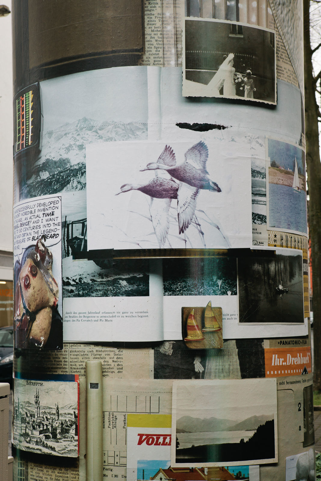 Die erste Plakatierung übernimmt der Künstler Philipp Hamann (geboren 1984 in Bayreuth, lebt und arbeitet in Köln), der von 2006 bis 2011 an der Kunsthochschule für Medien Köln studiert hat. Hamanns collageartige, aber auch performative Werke zeichnen sich durch die schöpferische Erzeugung von Sinnzusammenhängen aus, die immer auch eine spielerische und humoristische Komponente beinhalten. Seine beiden Motive „Opa 1 + 2“ sind „Legebilder“ bestehend aus gesammeltem Material, das durch die Form der Legung in einen neuen Kontext und ästhetische Gesamtheit gesetzt wird. Bei „Opa 1 & 2" handelt es sich um miteinander in Beziehung gesetzte Fundstücke aus dem Nachlass von Hamanns Großvaters, den er nicht mehr kennengelernt hat. „Eine spielerische Zeitreise als Annäherung an einen Arzt mit vielen Leidenschaften, in der das ihm geliebte Segeln und der Wind die treibenden Kräfte sind“, so Hamann.