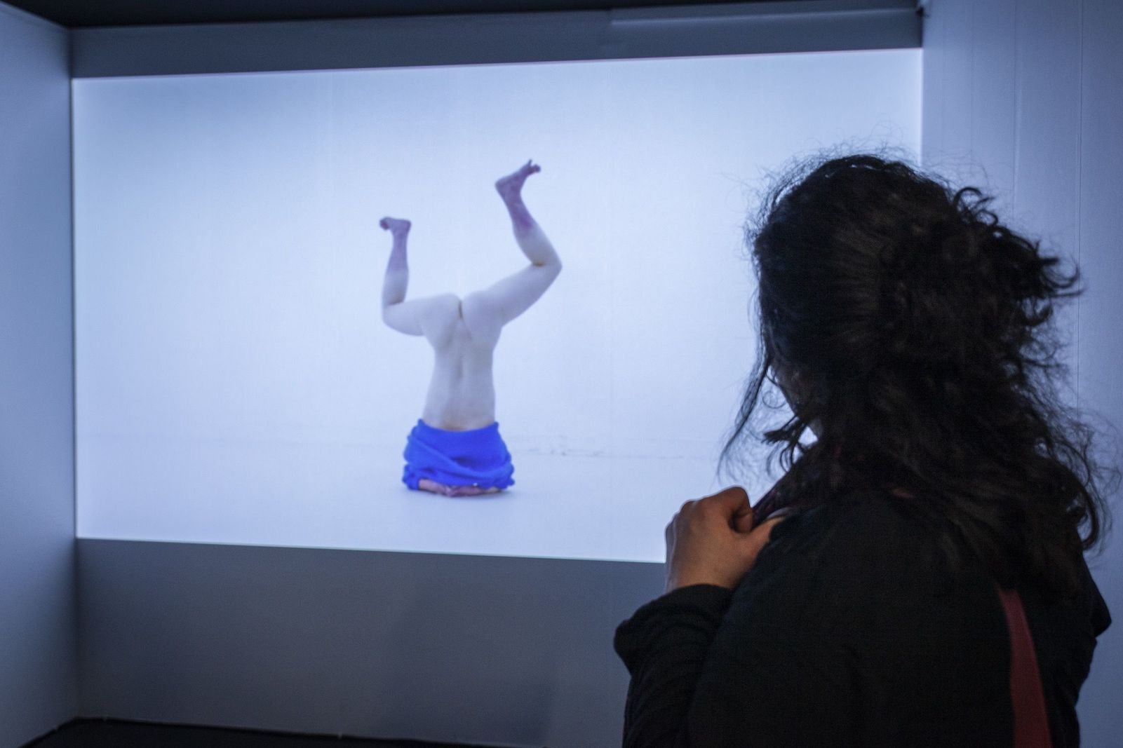 In Katharina Monkas mehrteiliger Installation „InH00118StevenVers.II 2018“ (2018) entsteht ein Beziehungsgeflecht zwischen dem Raum, der Architektur, verschiedenen Objekten und Bildern sowie an- und abwesenden Körpern. Dabei bilden Performer*innen immer wieder ein zentrales Element.