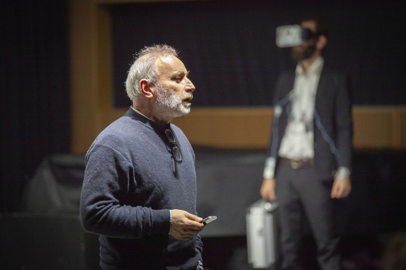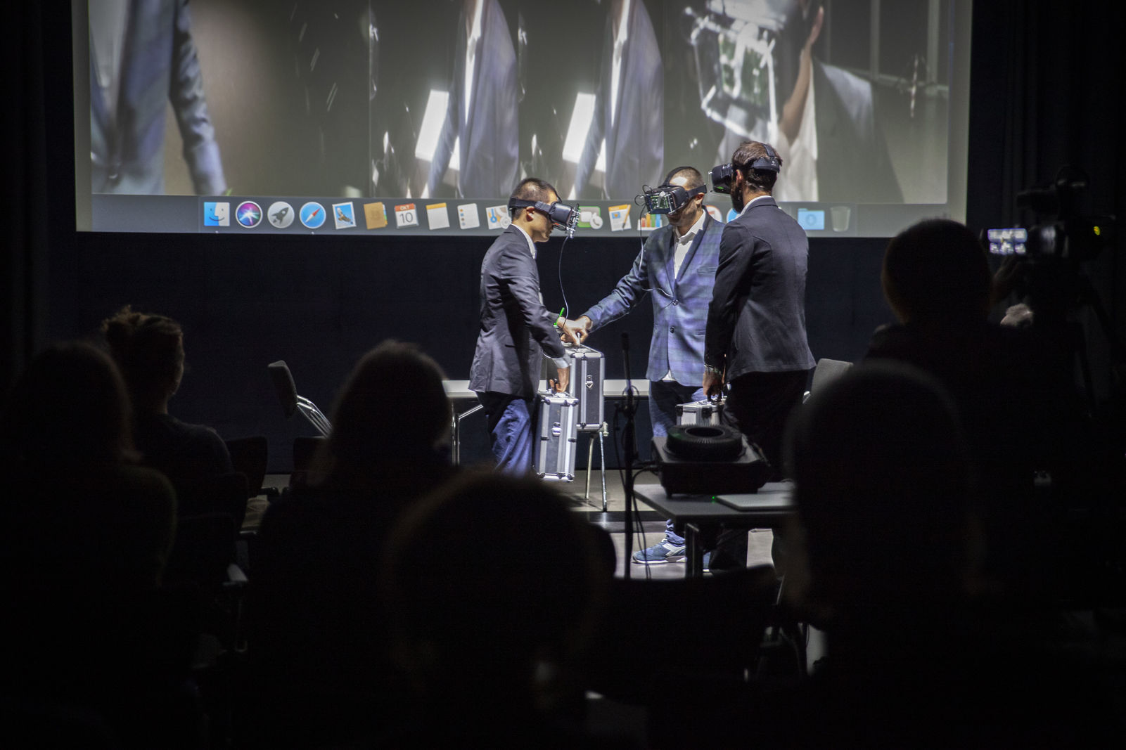 Das Trio aus Giorgi Gedevanidze, Phaidonas Gialis und Seongmin Yuk hat für seine Performance "Connected Reality” drei Brillen entwickelt, die den Perspektivwechsel erzwingen: A sieht, was B anschaut, B, das was C anschaut und C hat den Blickwinkel von A. Als ob das nicht schon verwirrend genug wäre, performen die Drei mit an ihren Körpern befestigten Mikrophonen und Lautsprechern eine experimentelle Choreographie der selbstauferlegten Unbeholfenheit, zu der Feedbackklänge zufälliger Konstellationen den Soundtrack abgeben.