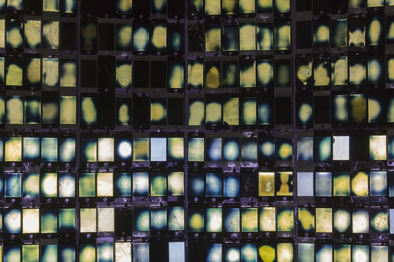 Based on Böll’s discovery of a box of damaged iPhones, Dead Pixels features a freestanding, choreographed grid of flickering phone screens that are individually re-programmed byBöll to mimic the individual pixels in a larger, abstract composition. Böll has an extensive knowledge of electronics from his work and studies at Information Technology and Network Systems, in Berlin, Germany, combined with his education from Academy of Media Arts, in Cologne.
