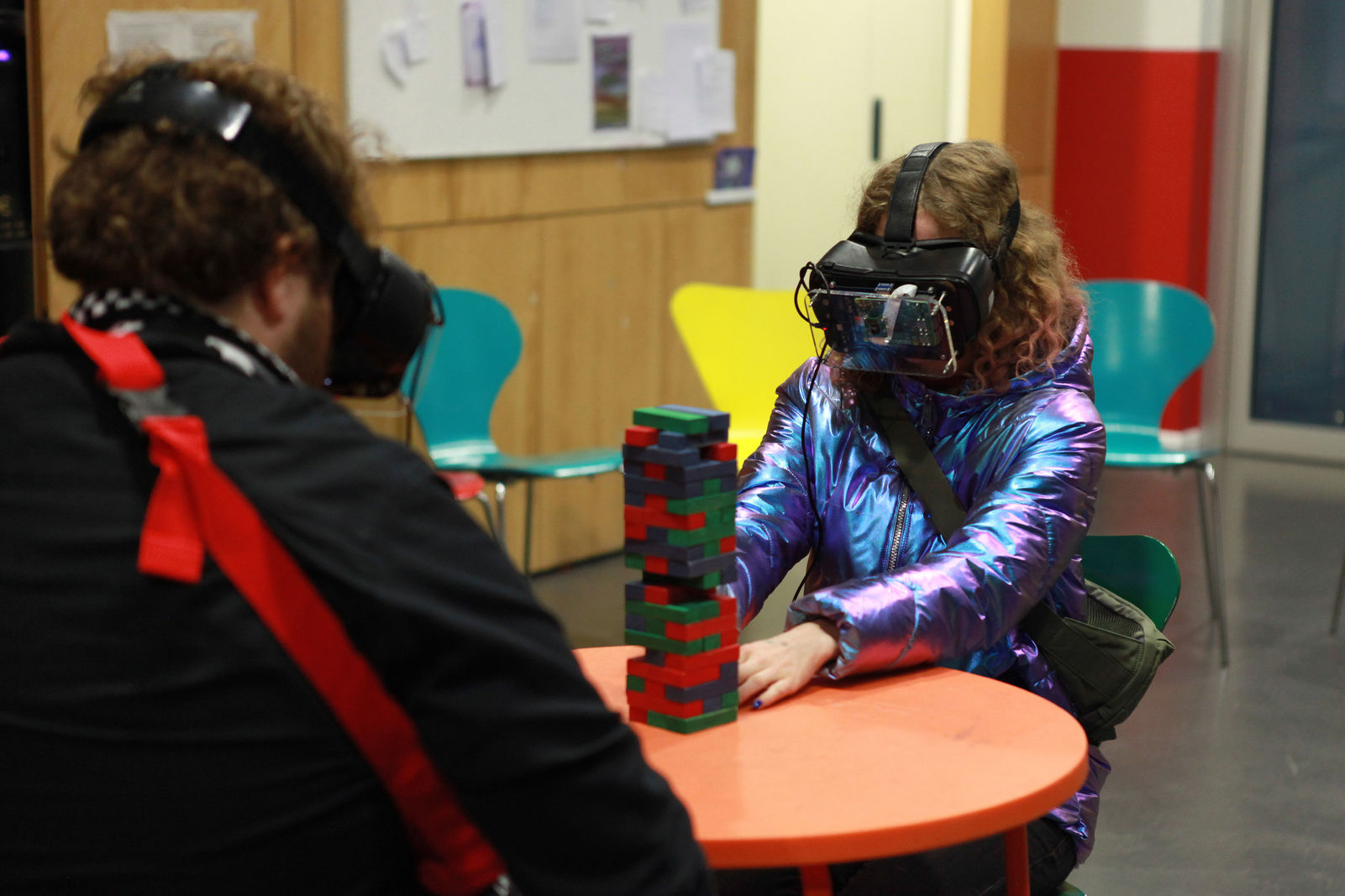 In der von Giorgi Gedevanidze, Phaidonas Gialis & Seongmin Yuk entwickelten interaktiven Installation spielen drei Besucher*innen gemeinsam Jenga, wobei jede*r Einzelne ein Headset mit VR-Brille trägt. Eine am Headset montierte Kamera nimmt dabei die Perspektive der ersten Besucher*in auf und überträgt diese live auf die VR-Brille der zweiten Besucher*in. Dies ermöglicht, dass jede*r Besucher*in eine Fremdperspektive einnimmt.
