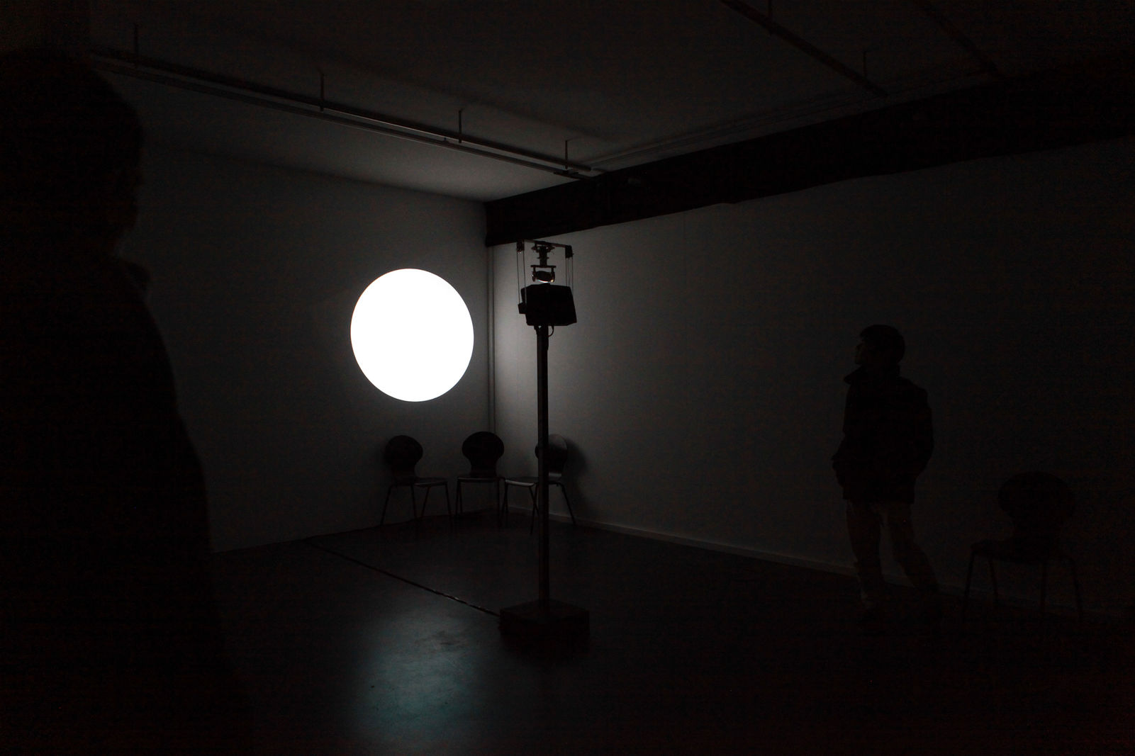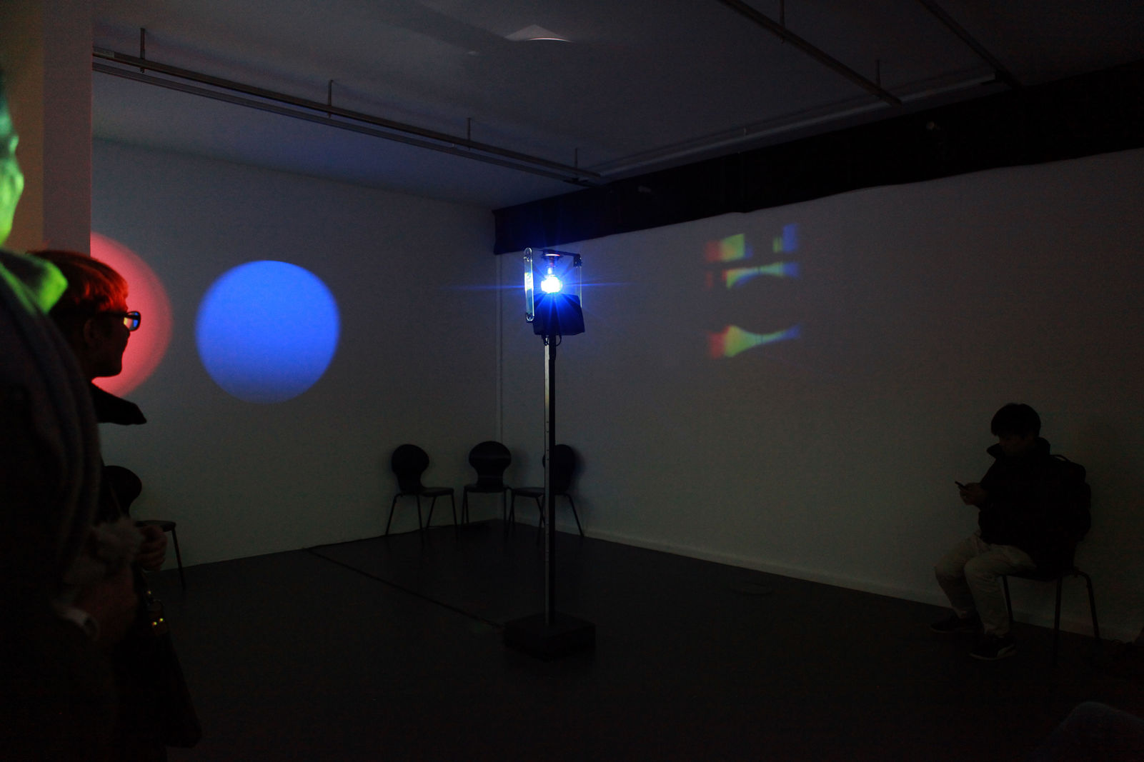 Die Rauminstallation RGBW von Camilo Sandoval & Dawid Liftinger fordert die konventionellen Vorstellungen von Film heraus und nutzt die technischen Eigenschaften zur Farbilderzeugung von Standard-Homeoffice-Projektoren, um eine immersive Rauminstallation zu erzeugen. Grundkomponenten von Film – Geschwindigkeit, Farbe, Licht und Dunkelheit – werden choreographiert und inszenieren den Raum. Wir dekonstruieren den Projektionsprozess selbst und plädieren für die Überlegenheit technischer Apparate gegenüber dem menschlichen Auge. Ein rotierender Spiegel vor der Linse des Projektors, nutzt den Flächenlichtmodulator, also das digitale Lichtverarbeitungssystem (DLP), welches die Illusion von Farbe erzeugt, und verwandelt die eigentlich weiße Projektion in ein oszillierendes 360°-Panorama-Kaleidoskop.
