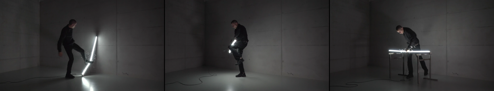 Die lineare Form des Leuchtkörpers ist verändert und die Vorlagen der Norm aufgehoben. Mittels Fusstritt wurde die Verformung ausgelöst. Der Knick im Material lässt ein Gebrechen vermuten, doch die Funktion bleibt erhalten. Die Lichtausbeute bleibt unverändert.