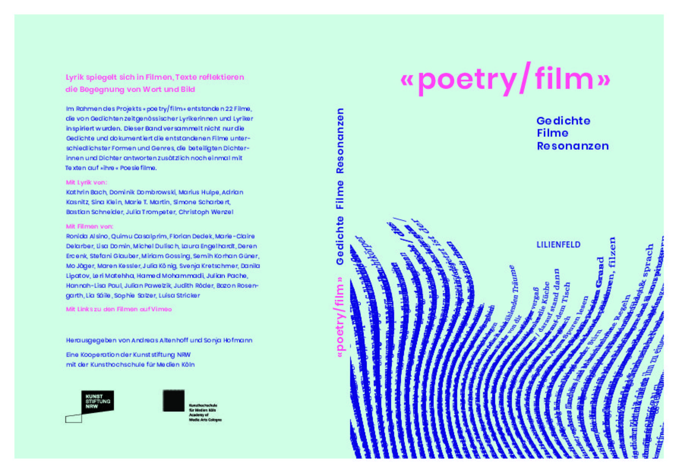 Von 2013 bis 2019 entstanden an der Kunsthochschule für Medien Köln 22 Filme, die von Gedichten zeitgenössischer Lyrikerinnen und Lyriker inspiriert wurden. Der Band "poetry/film" versammelt diese Gedichte und verweist auf die Filme, die sich durch unterschiedliche Formensprachen auszeichnen und sich oft weit von den Gedichten entfernt haben. Hinzu kommt eine weitere Ebene: Die am Projekt beteiligten Dichterinnen und Dichter waren eingeladen, auf die Filme zu reagieren. Diese „Resonanzen“ gehen mit der gleichen künstlerischen Freiheit auf die Filme ein wie schon die Filme auf die Gedichte. Bei aller Intensität des jeweiligen Dialogs wahren so die Gedichte, Filme und Resonanztexte immer ihre individuelle Form und Autonomie.