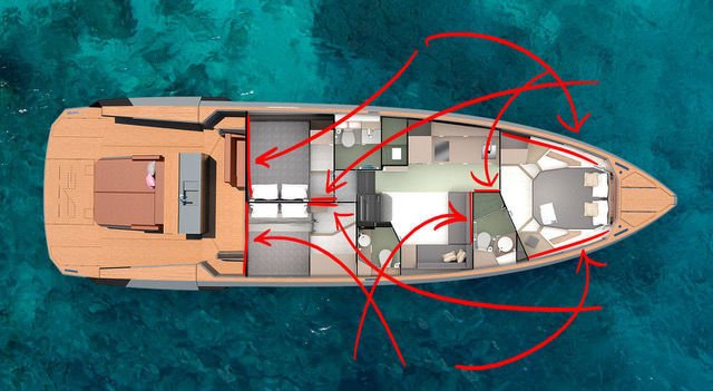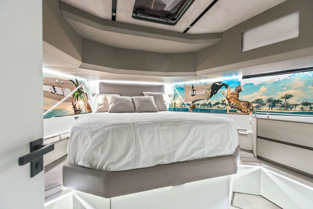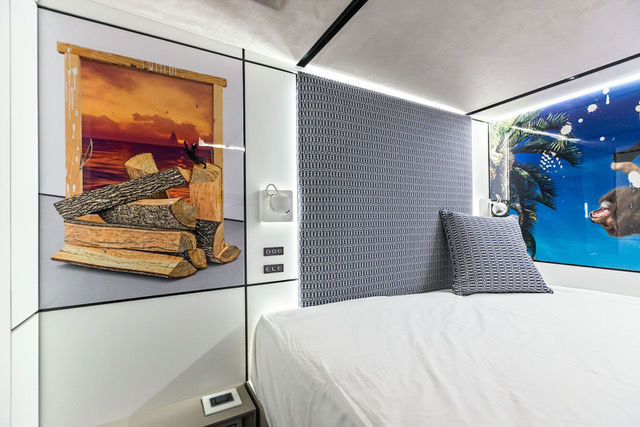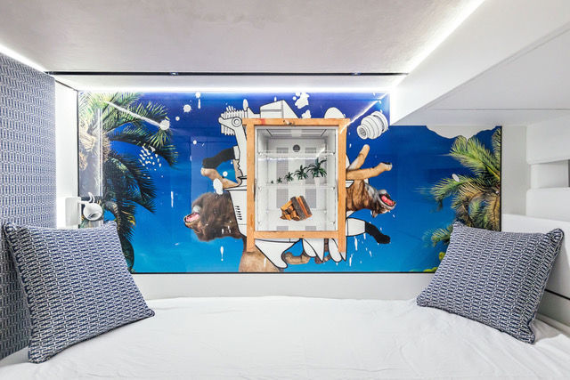 “Brilon Realism” consists of eight individually designed wall panels, integrated into the interior architecture of a yacht. Bendzulla reflects upon the unique context of the works in a number of ways. A yacht is first and foremost a luxury product, serving for the personal indulgence of its owners but also to demonstrate their status. Value and value creation thus immediately emerge as themes for any artistic work to be produced for such an environment. “The individual works make numerous and often contradictory uses of ‘high-value’ aesthetics. All of the works thus have perfectly smooth, high-gloss surfaces that are nevertheless counteracted by numerous aesthetic decisions. Color-smeared wooden blocks are being used repeatedly, for instance, with a cheap and functional appearance that clearly runs counter to the high-gloss look. The numerous computer-animated elements in the images are also far from being perfect simulations of their visual reference points. Landscapes, plants, and animals are rendered with a cold, mathematical angularity totally opposed to their organic origins. Deficiency and perfection are combined, producing a highly contradictory aesthetic. Maximal financial possibilities facilitate the highest degree of perfection; perfection in turn demands maximal control and modification. But many elements in my images quote different forms of losing control. Dashes of paint often appear as impurity within the works, but are also used very much consciously as a means of composition; drawings often appear as spontaneous scribbles, but also as representations of technical apparatuses. Representations of nature are very significant here because they highlight the internal logic and self-organization of natural processes, while also presenting them as always already domesticated. The modification of nature as a classic form of value creation is also addressed, here in the form of the various “aggregate phases” of wood as a raw material: it manifests itself in a range of forms, from trees to firewood piles to trestles and precisely formed picture frames. There are also potted plants and predators, seemingly performing circus-like choreographies. And this is all within a formal language that is realistic but digitally abstract. Some motifs simply refer to the biographies of the persons who commissioned the works. For example, their home towns of Cologne and Brilon are represented by characteristic buildings and lettering.”