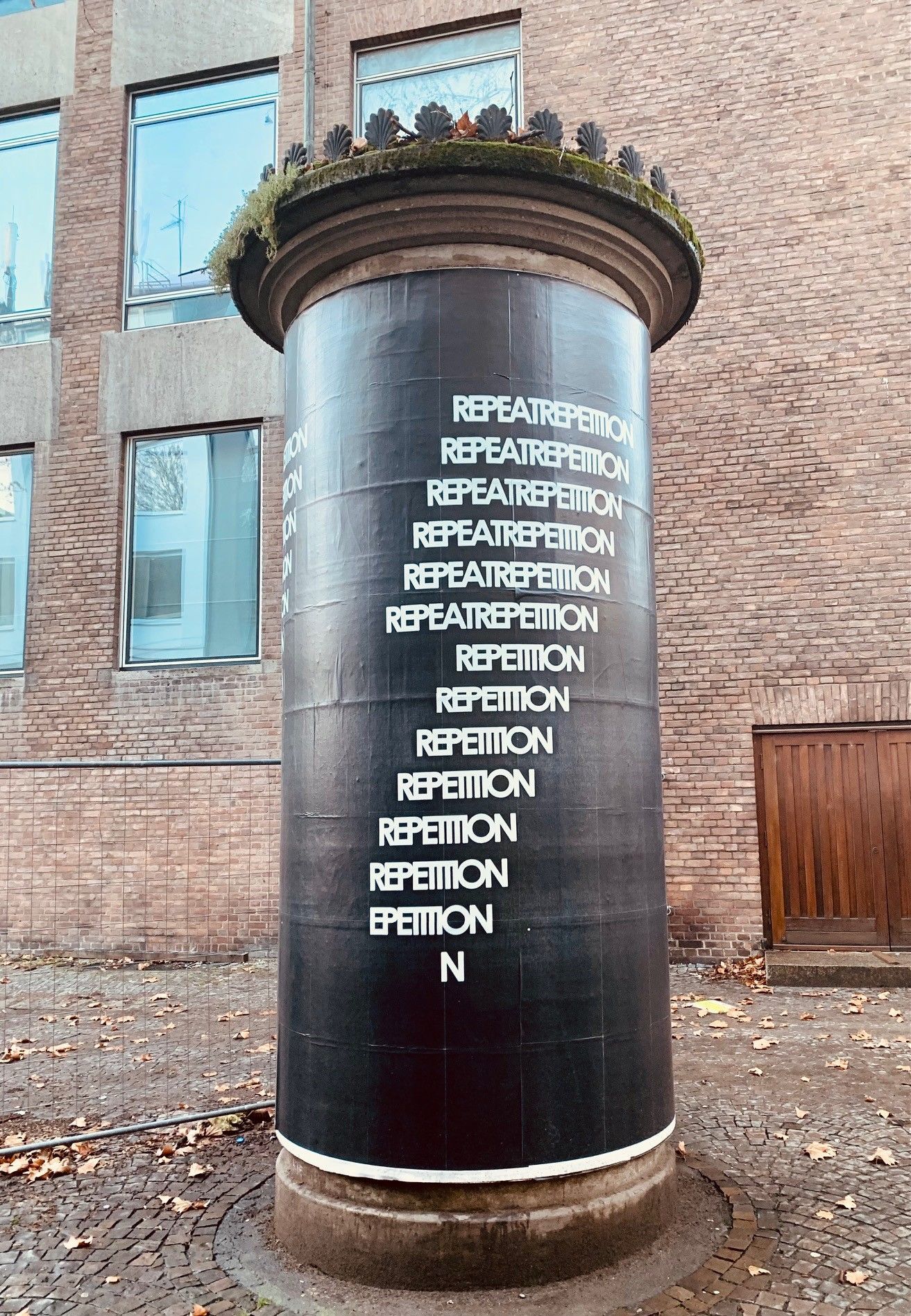 Auf den 25 Kölner Litfaßsäulen wird den Betrachterinnen und Betrachtern eine sich stetig wiederholende Aufforderung zur Wiederholung gezeigt, eine sich um sich selbst drehende Aussage ohne Inhalt.