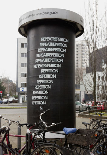 Auf den 25 Kölner Litfaßsäulen wird den Betrachterinnen und Betrachtern eine sich stetig wiederholende Aufforderung zur Wiederholung gezeigt, eine sich um sich selbst drehende Aussage ohne Inhalt.
