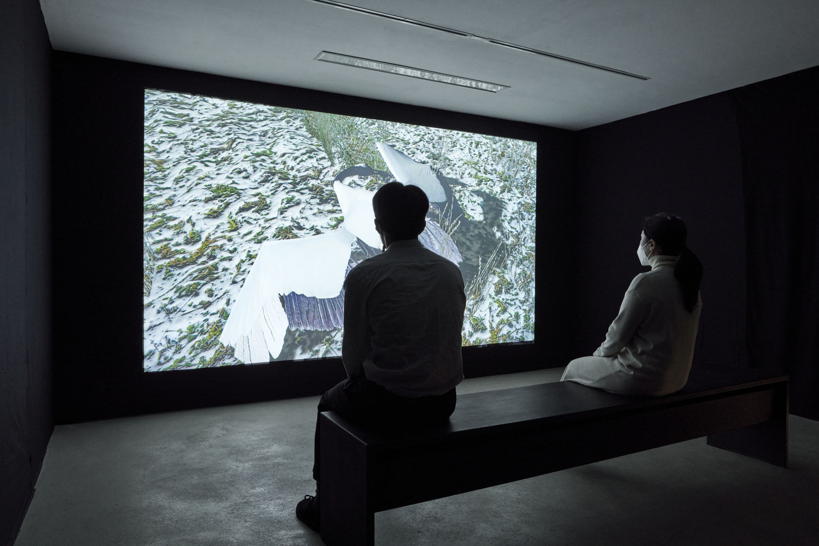 Im Zentrum von Seongmin Yuks Arbeiten stehen die gemeinsamen Merkmale und Vorstellungen von digitalem Wandel und Menschheit, deren Verbindungen in Video, Performance, Installation und Raummanipulation ihren Ausdruck finden. Das Einkanalvideo „I could once speak under two moons“ dekonstruiert den Schöpfungsmythos der Insel Jeju und wirft einen alternativen Blick auf dessen Bestandteile. Die Arbeit ist eine Umdeutung der Erzählung über die Entstehung von Jeju, in der dank menschlichem Eingreifen in das in Vorzeiten durch das tägliche Aufgehen von zwei Sonnen und zwei Monden verursachten Durcheinander eine friedliche und geordnete Oase der Ruhe entstand. Yuk erzählt die Geschichte aus der Sicht von Soldaten und Motten, um die menschliche Legitimation der eigenen linearen, humanozentrischen Einflussnahme zu hinterfragen.