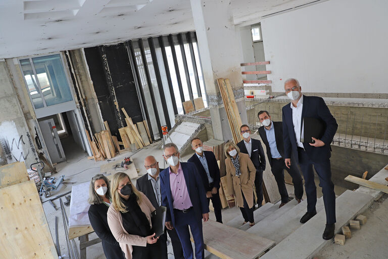 In der Baustelle am Heumarkt 14 mit Vertreter*innen der Handwerkskammer, der KHM und den Architekten. Im Vordergrund rechts: Garrelt Duin, Hauptgeschäftsführer der Handwerkskammer zu Köln, links: Wiebke Golombek, Stv. Kanzlerin der KHM. Foto: © Jascha Habeck.