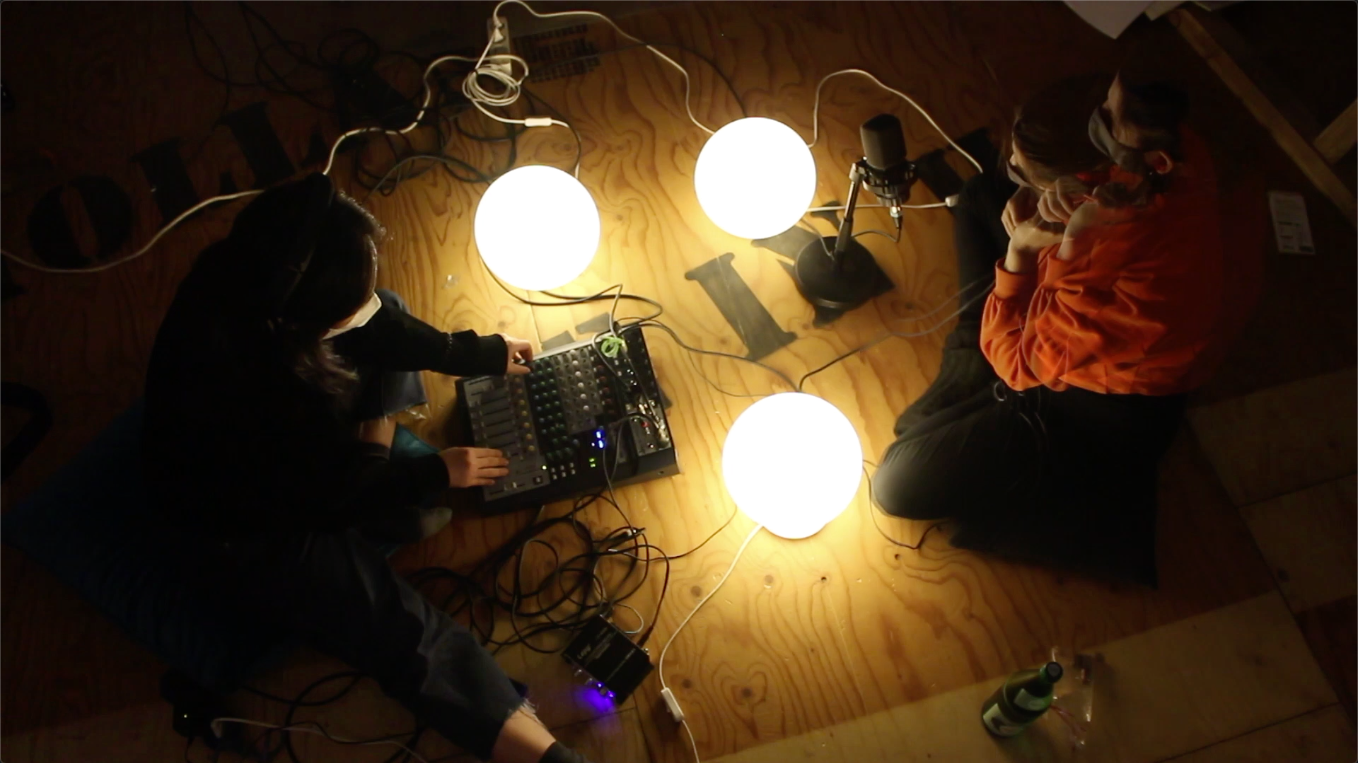 Werktext: Kontrolle ist in den Arbeiten von Elisa Kühnl und Jiyun Park ein prägender Aspekt. Kühnl hat ihre Stimmpraxis darauf ausgelegt, die Regeln des normalen Gebrauchs der Stimme zu hinterfragen und somit in die spontanen Bereiche von Laut und Geräusch vorzudringen. Die Entscheidung sich mit den komischen und schrillen Momenten der Stimme zu befassen ist ein kontrollierter Griff. Park baut ihre Instrumente selbst, mit der Intention, damit Feedback zu erzeugen. Sie wählt die Form und ihr Material gezielt nach dem Prinzip der Rückkopplung aus. Aus diesen beiden Positionen heraus haben sich die Musikerinnen zusammen getan, um den jeweils eigenen Umgang mit Kontrolle an die anderen Person abzugeben. Das selbstentwickelte Instrument von Park wird durch den Körper von Kühnl ersetzt. Die befestigten Lautsprecher erzeugen Feedback im Zusammenspiel mit den Kontaktmikrophonen, die sich am Hals der Sängerin befinden. Die Rückkopplungsgeräusche wandern durch Kühnl's Körper. Deren Intensität kann Kühnl bestimmen. Die Mikrophone werden von Park am Mixer gesteuert.