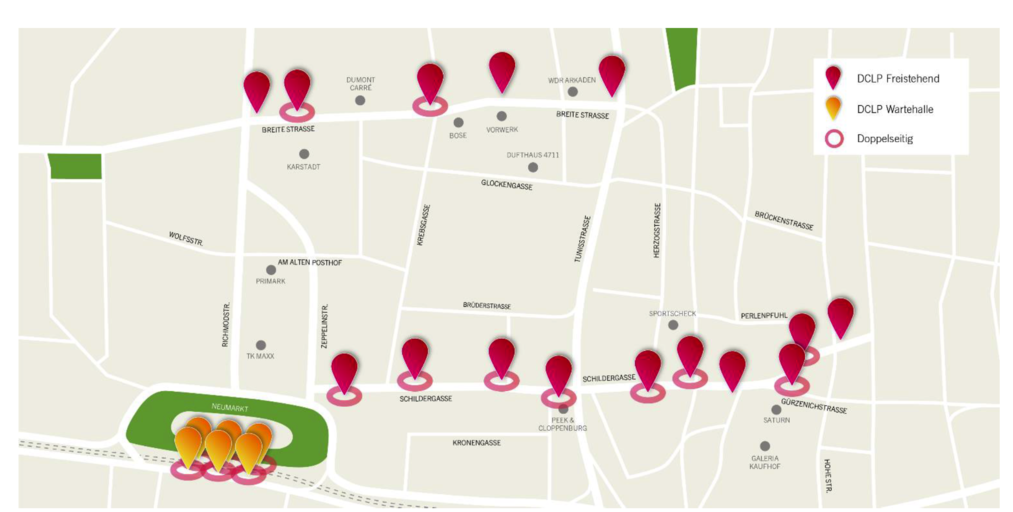 Die digitalen CLPs werden vom 20. Juli bis 2. August 2021 in Köln entlang der Schildergasse, Breite Straße, Ehrenstraße und am Neumarkt im Loop gezeigt.