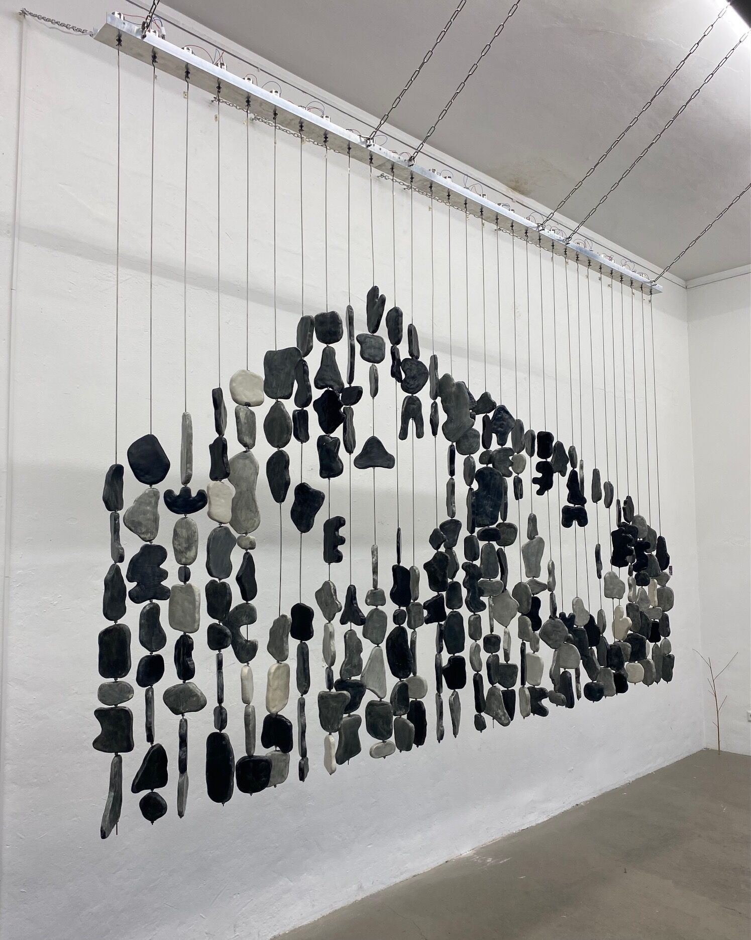 Die hängende Installation besteht aus rotierenden Tonstücken, deren leichte Berührungen eine subtile Klangdynamik aufbaut. Von oben bietet es eine klangliche Begegnung basierend auf der Position des Betrachters.
