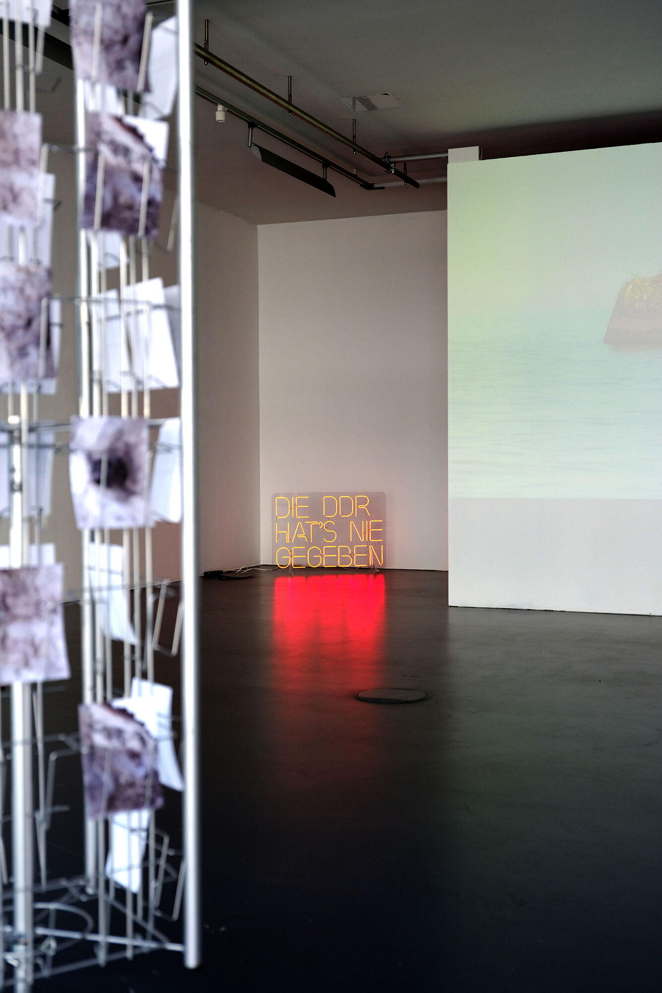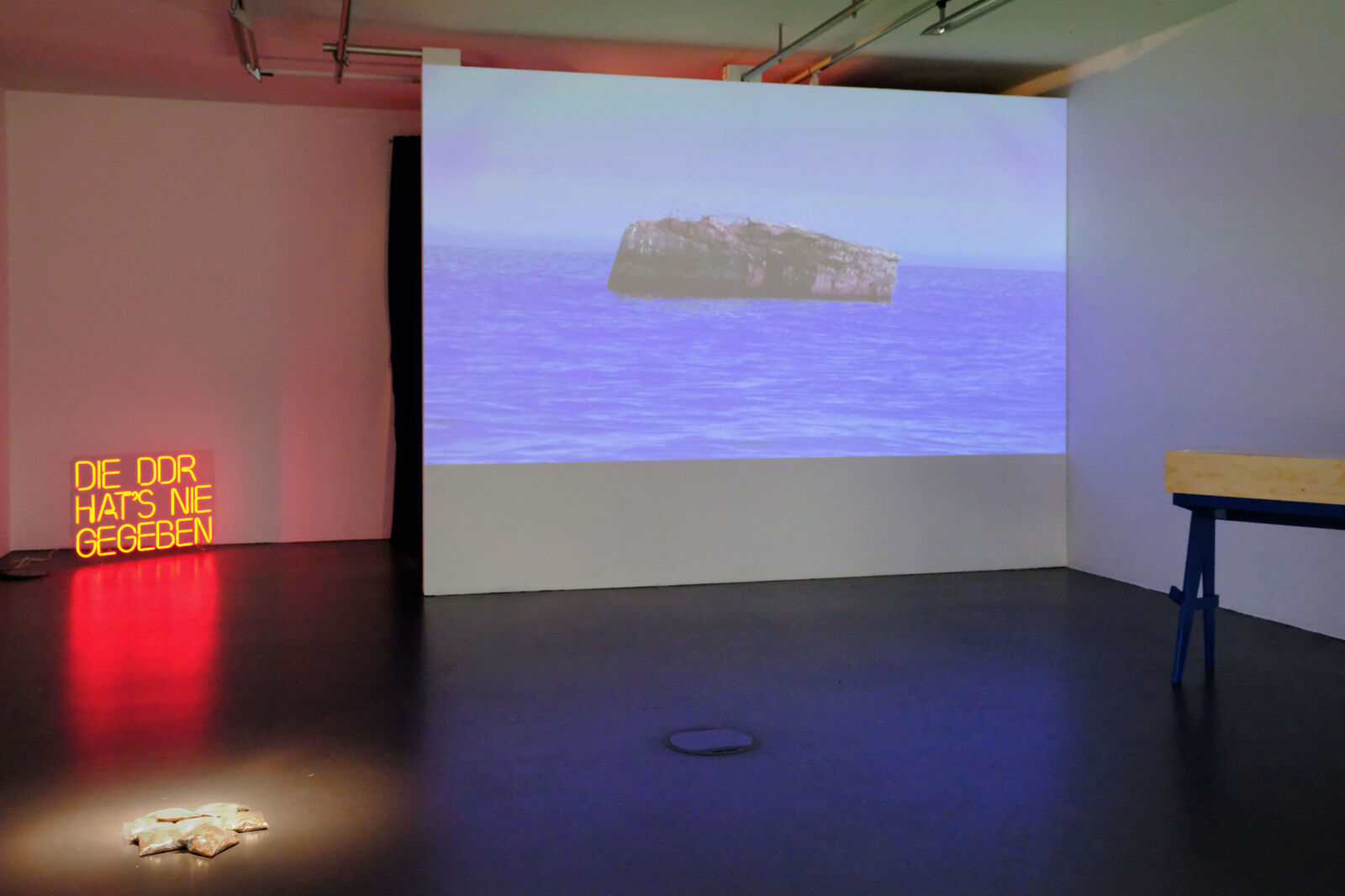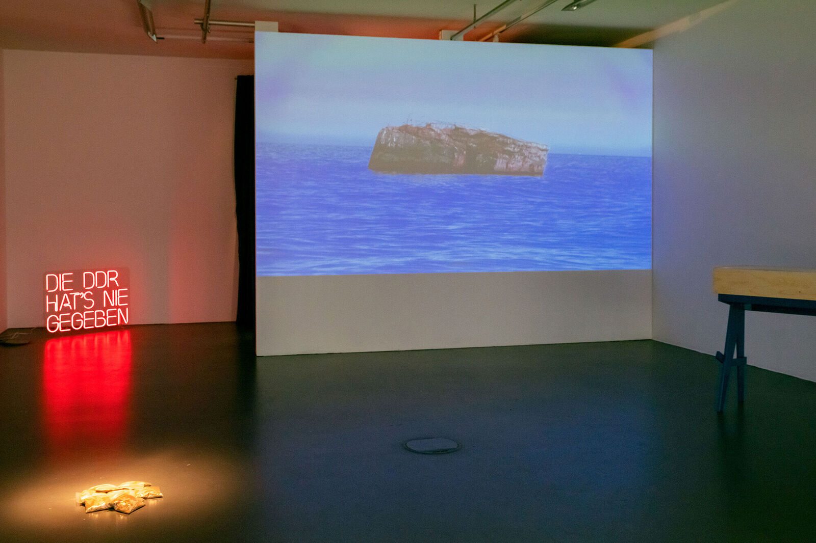 In ihrer Mixed-Media-Installation Die DDR hat’s nie gegeben (2021) setzt sich Anne Arndt mit dem Erbe der DDR auseinander am Beispiel einer Bunkeranlage an der Ostsee, die in der DDR als Grenzsicherungsanlage genutzt wurde. Die Bunker sind mittlerweile durch Stranderosion von der Küste ins Meer gewandert. In weniger als zehn Jahren werden sie komplett im Meer versunken sein. Das Verschwinden dieser Monolithen dient Anne Arndt als Metapher für den Umgang mit der Geschichte der DDR und verweist auf Konzepte wie Heimat versus Flucht, History versus Memory, Identität versus Othering.