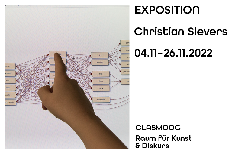 In seiner Einzelausstellung "Exposition", die vom 4. bis 26.11.2022 in GLASMOOG zu sehen ist, zeigt Christian Sievers (geb. 1974, lebt in Köln) ein interaktives System, in dem das Publikum mit zwei Künstlichen Intelligenzen interagieren und sich deren Entscheidungs- und Prognosefähigkeiten aussetzen kann. In einem „Aufnahmeraum“ analysiert und beschreibt eine visuelle Szenenerkennung das Geschehen vor einer Kamera. Das Publikum, das diesen Aufnahmeraum betritt, sieht sich im Videobild zusammen mit einer von der KI verfassten Beschreibung des Bildes als direktes Feedback auf das eigene Agieren vor der Kamera. Die Szenenerkennung registriert nicht nur einzelne Personen oder Objekte, sondern stellt Vermutungen über das Zusammenwirken der Menschen vor der Kamera an. Bei bestimmten gemeinsamen Handlungen des Publikums vor der Kamera wird ein zweiter Prozess ausgelöst. Die Beschreibung der Situation im Ausstellungsraum dient wiederum einer weiteren künstlichen Intelligenz (GPT-3 – Generative Pre-trained Transformer 3) dazu zu imaginieren, was alles katastrophalerweise schief laufen könnte. Das Publikum wird zur Akteur*in in automatisch erstellten Narrativen, in denen eine im Entstehen begriffene Technologie unsere Ängste und Sehnsüchte sich selbst gegenüber formuliert.