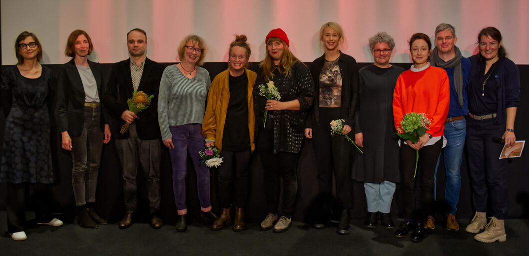 Die Stipendiat*innen: Sámuel Visky (3. v. l.), Laura Engelhardt (5. v. l.), Miriam Gossing & Lina Sieckmann (6.+7. v. l.) und Katharina Huber (3. v. r.) mit Mitgliedern der Jury, Ruth Schiffer, Filmreferentin MKW (2. v. l.) und Sonja Hofmann, Geschäftsführerin Filmbüro NW (1. v. r.) | Foto: Conny Beissler