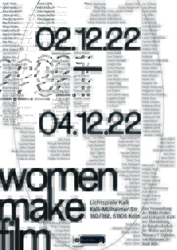 Vom 2. bis 4. Dezember wird die 14-stündige Dokumentation "WOMEN MAKE FILM" erstmals in Köln im Kino gezeigt. Der Dokumentarfilm des britischen Regisseurs und Filmkritikers Mark Cousins (2018, 840 Min.)  wird in 7 Blöcken à 2 Stunden präsentiert und eröffnet eine andere Perspektive auf die Filmgeschichte.