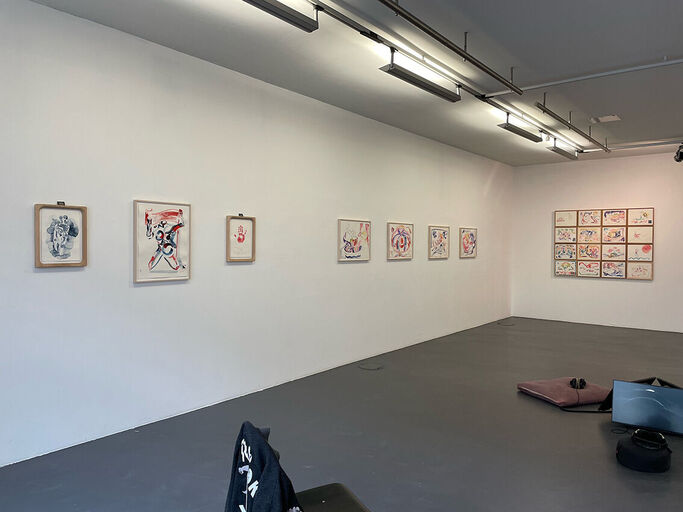 "When the wet paint spreads across the paper, a whole world opens up. Nikolas Müller's artistic cosmos unfolds between coincidence and inspiration, letting go and holding on, wanting and being able. The clouds of colour are surrounded by lines that are constantly reconstituting themselves. The clouds are, too, in the process of becoming and still have to reach their final form. Instead of setting boundaries for the color fields, they embrace them. They organically fit together and into each other. Our gaze meanders along the bending, winding and enclosing lines and never tires of the rich play of colors, the back and forth between abstraction and figuration. Like the river that repeatedly overflows its bank (if it is lucky enough not to have been straightened out of capitalist interests), Müller also repeatedly overflows the borders between different shapes. Personal things are recorded and at the same time placed in relation to current discourses or daily politics. Ironic meets harsh reality. It's a constant back and forth — just like life itself. […]