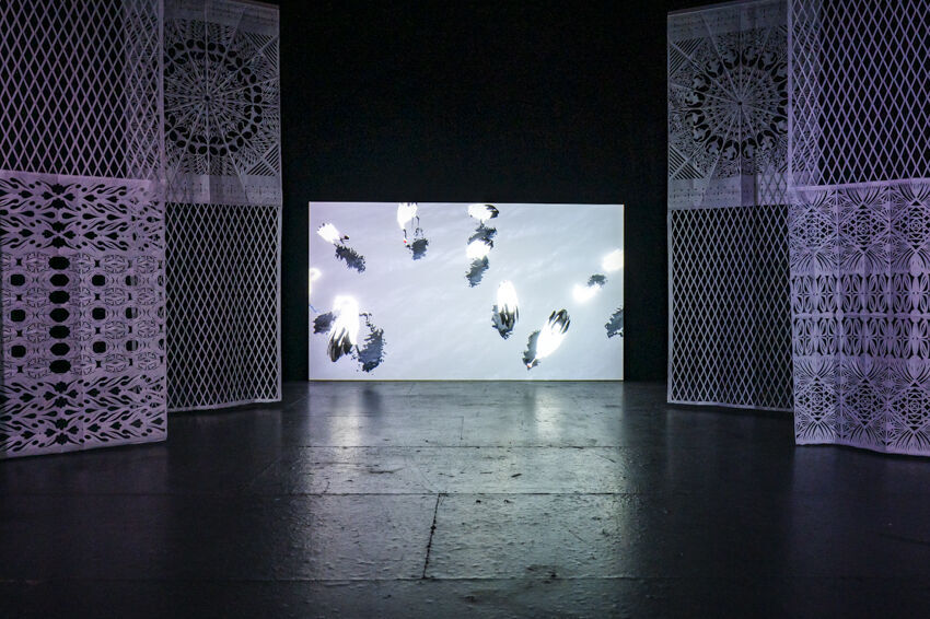 Die Schwingen eines Kranichs, schneebedeckte Bergspitzen, eine Geisterarmee: Hanna Nohs 3D-Grafikanimation über das DMZ Grenzgebiet zwischen Nord- und Südkorea hat einen stark immersiven, meditativen Charakter, dem man sich nur schwer entziehen kann. Der symbolbehaftete Rotkronenkranich, auf dessen Flügeln wir durch das Gebirge getragen werden, wird in einem schamanischen Tanzritual zu einem metaphorischen Sinnbild des Friedens. Die schemenhaften Figuren in dem in blassen Weiß- und Grautönen gehaltenen Bildern geben dem Video etwas geisterhaftes, so als ob sich die Künstlerin einer realistischen Darstellung der DMZ bewußt entziehen möchte. Tatsächlich wirft der poetisch-theoretische Text dieses Videos Fragen über die Darstellbarkeit dieser Region auf und entlässt die Besucher*innen mit der Erkenntnis, dass ein Zeichensystem auch immer ein spiritueller Akt ist. Damit öffnet Hanna Noh eine Herangehensweise an Kunst, die hierzulande zwar nicht verloren, aber doch eher selten in der westlichen Welt ist.