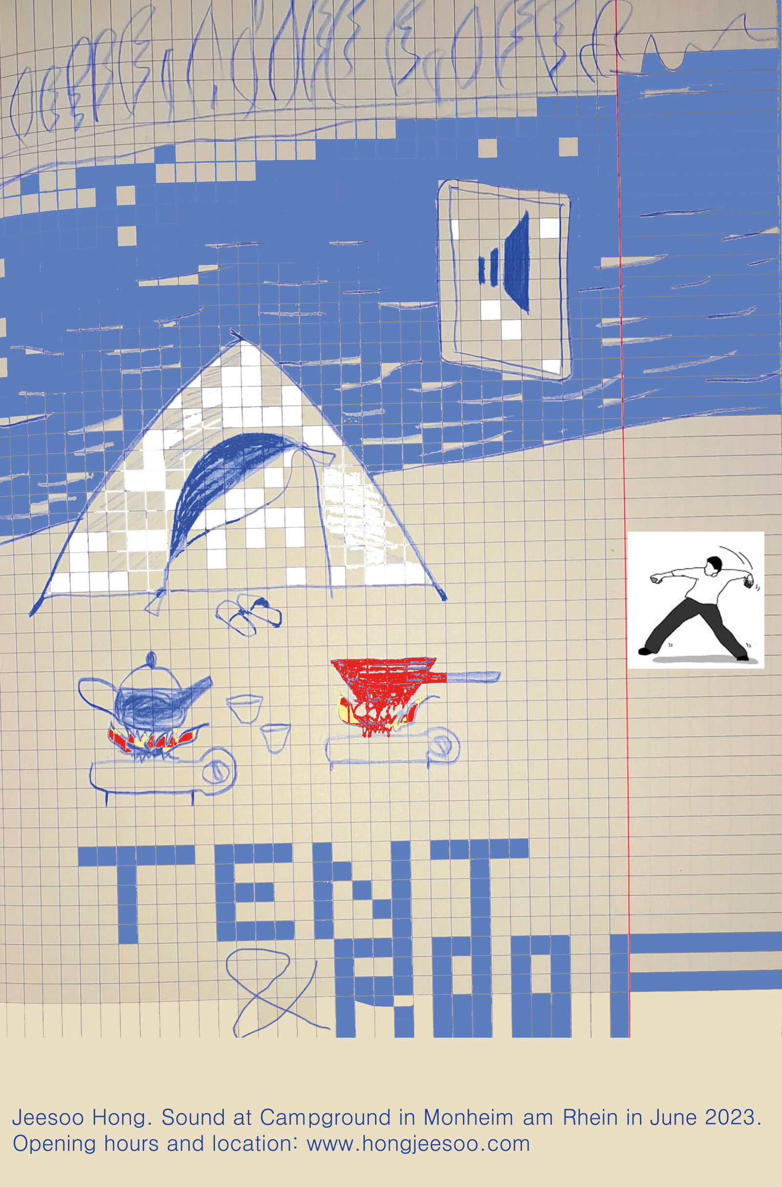 "Tent and Roof" ist eine situative Klangarbeit, bei der die Künstlerin Jeesoo Hong Besucher in ihr Zelt auf einem Campingplatz am Rhein in Monheim einlädt. Dieses Zelt ist ein temporärer Ort, an dem die Besucher vorbeikommen und ein Klangstück auswählen können, als ob sie aus einem Menü wählen würden.