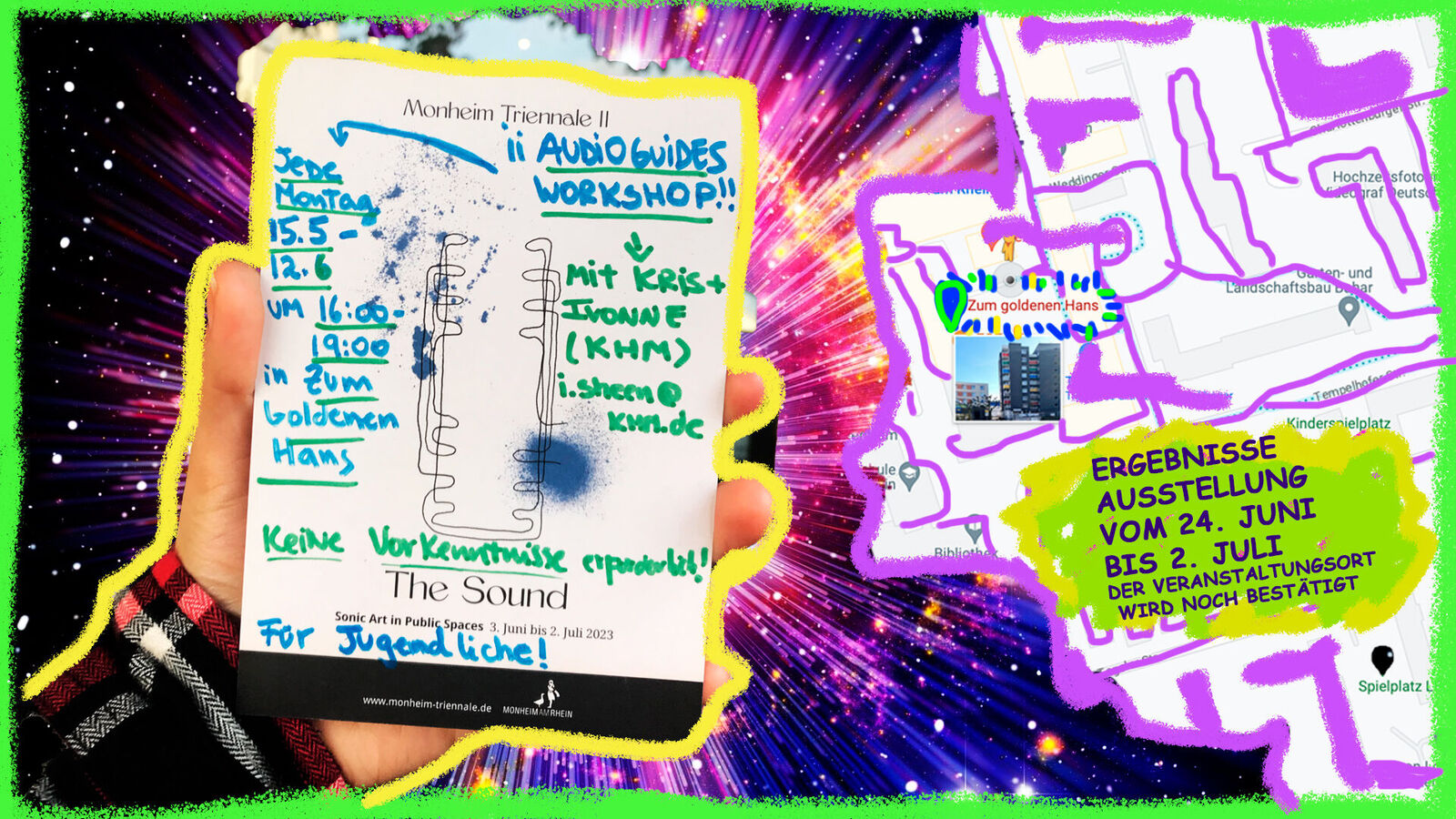 "Klänge und Stimmen, die Geschichten aus Monheim erzählen", ist ein Audioguide-Workshop von Ivonne Sheen Mogollón und Kris Bublevskaya für junge Menschen, die in Monheim leben. Er findet zwischen 15.5. und 12.6. immer Montags im Haus "zum goldenen Hans" statt. Im Workshop sollen ausgehend von den eigenen Phantasien und Alltagserfahrungen der TeilnehmerInnen interaktive Audioerfahrungen für den öffentlichen Raum entstehen. Die Ergebnisse des Workshops werden in der letzten Juniwoche präsentiert, Ort und genaue Termine werden noch auf der Festival Website bekannt gegeben.