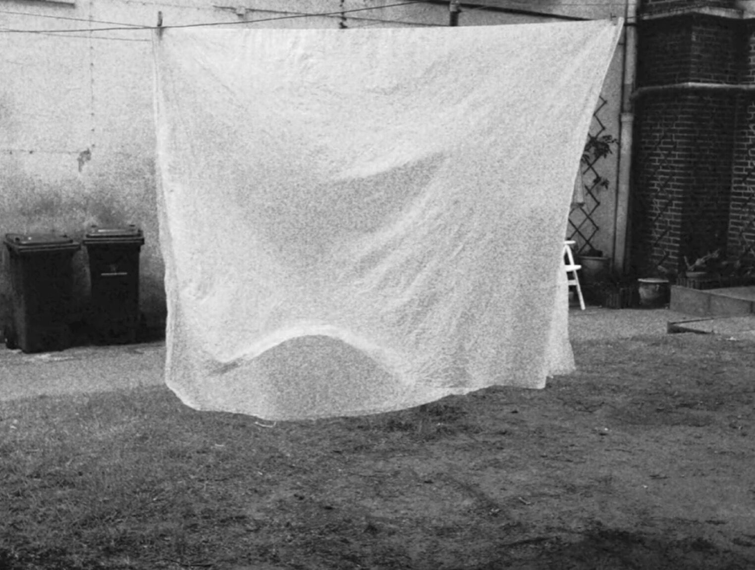 Die am Ende zum Trocknen aufgehängte Wäsche, bildet eine durchgangsartige Installation, deren Durchlaufen die Wahrnehmung der akustisc, abgeschirmte Umgebung verändert.
