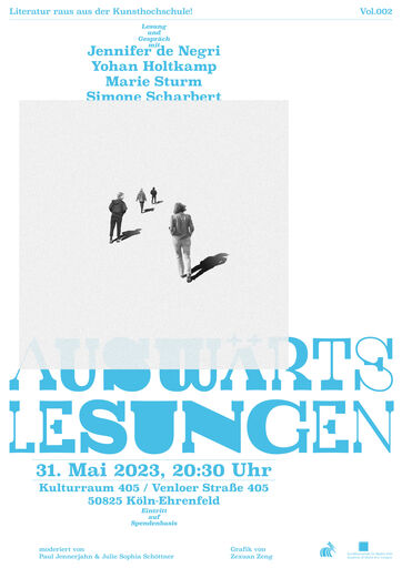 Auswärtslesungen – das ist eine neu gegründete Lesereihe von KHM-Studierenden des Literarischen Schreibens. Sie möchten aus der Institution Kunsthochschule heraustreten und rein in die Stadt, eine gemeinsame Bühne schaffen und Austausch finden, Texte miteinander teilen, lesen, zuhören, diskutieren. Zu jeder Veranstaltung laden die Auswärtslesungen drei Studierende der KHM sowie eine*n weitere*n Autor*in aus dem Raum Köln zu Lesung und Gespräch ein.