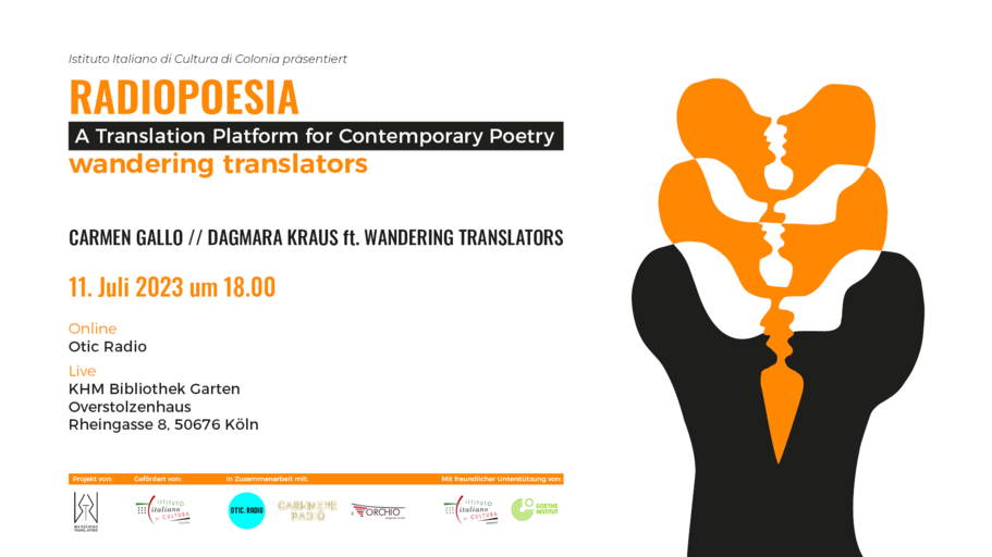 The cooperation "RadioPoesia" between otic.Radio and Wandering Translators is sponsored by the Italian Cultural Institute Cologne and supported by the Italian Cultural Institute Hamburg and the Goethe Institute. The project was developed by Wandering Translators. The supporting media partners are Cashmere and otic.radio.