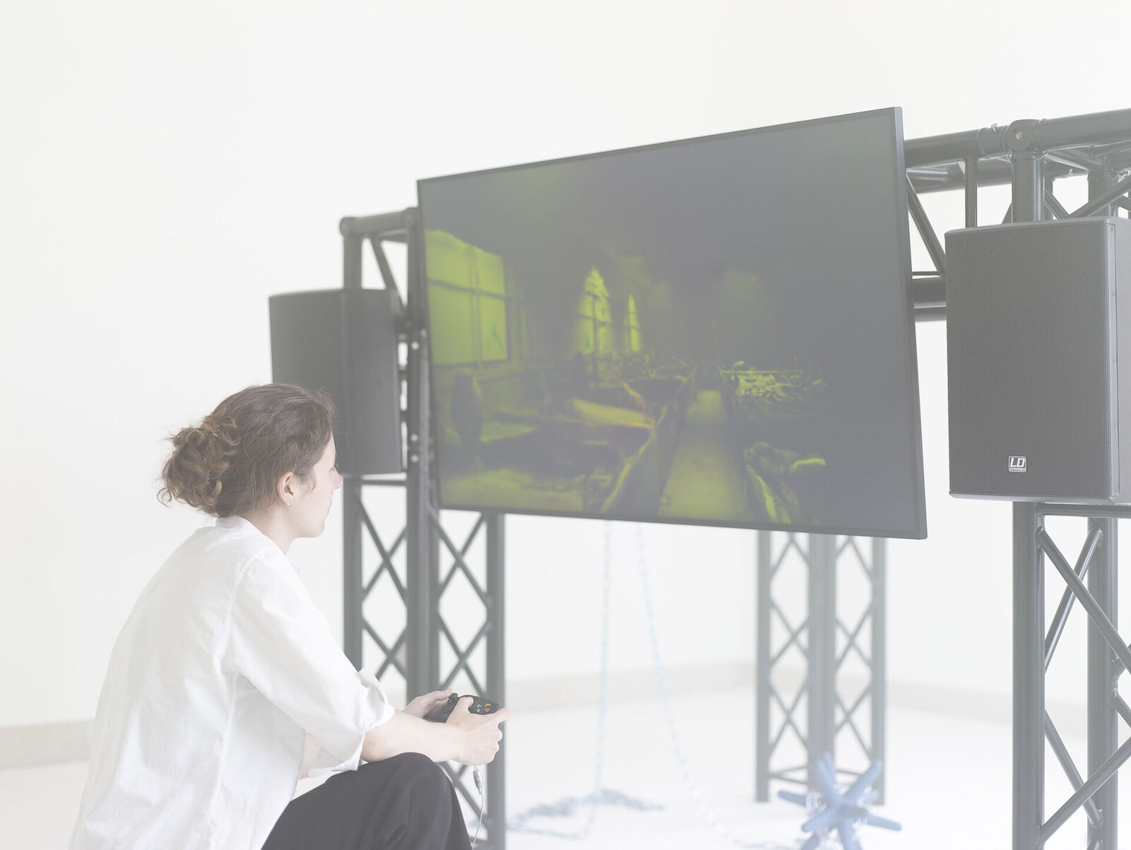 Ausgangspunkt von De Profundis ist ein zufälliger Moment, in dem sich Tierindustrie und Kulturindustrie auf grausame Weise berühren. Während Schweine getötet werden, ist ein Song zu hören, der vielleicht einmal die Selbstermächtigung eines Menschen beschrieb. Im Radio der Fabrik verunklart sich jedoch die Botschaft des Songs: Er wird zum manischen Soundtrack der Agrilogistik als scheinbar unaufhaltbare Maschinerie, dessen Echo sich, im Ausstellungsraum gefangen, immer weiter destrukturiert. Unter dem Einsatz digitaler Medien ruft Pascal Marcel Dreier unterschiedliche Akteur*innen zu einer ungewohnten Crew zusammen. In der Video Game Installation gehen sie auf in einem mitreißenden Sog aus Fakten und Fiktionen, Aneignungen und Gegen-Aneignungen, in dem sich ihre Rollen unaufhörlich neu konfigurieren.