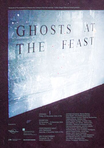 The works were discussed collectively among the artists in the seminar “urban stage ff.” by Prof. Mischa Kuball. The way connections are woven between the artworks is the immediate result of our reception of the special architecture of the WKZ and the relationship of each work to the notion of ghost. The artists are organized in groups, so-called “zones”, where they share ideas, support each other, and find links between their works. By means of overlapping, these zones create a collective landscape.