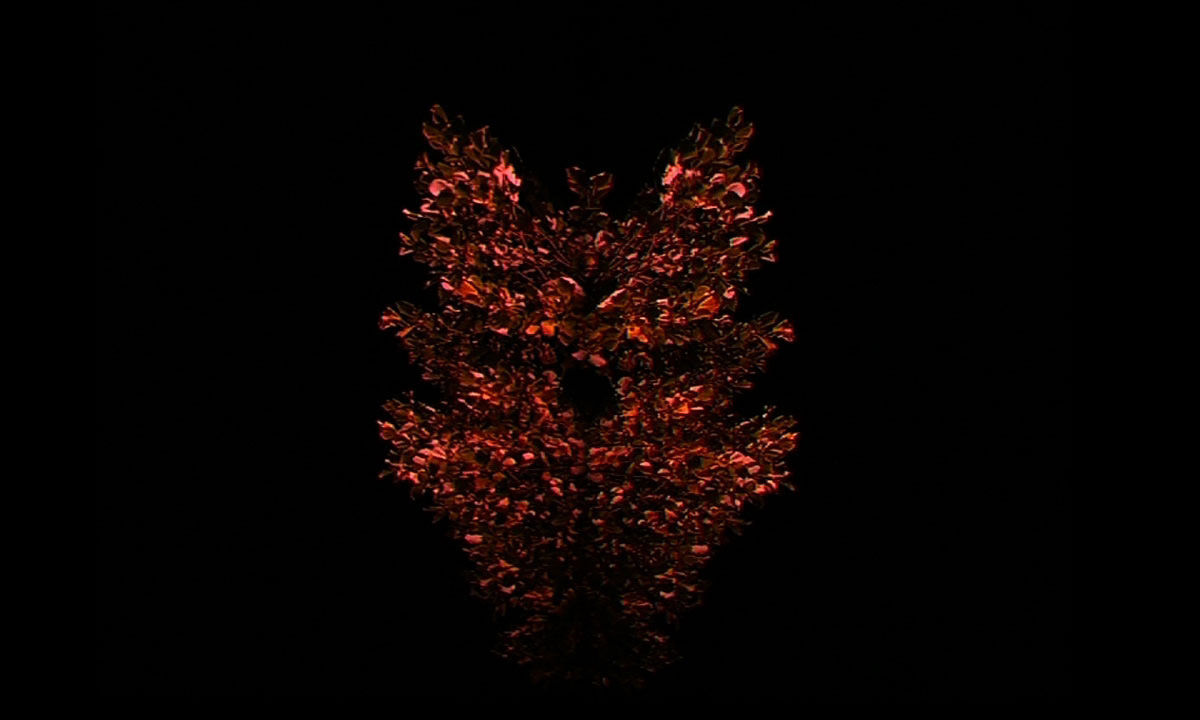 Thorsten Hallscheidts Videoinstallation „Der große Erzähler“ zeigt nächtlich beleuchtete Äste eines Baumes, die sowohl an der Zeit- als auch an der Raumachse gespiegelt wurden. Ein gleichmäßig starker Nachtwind bewegt die bereits herbstlich kupferfarbenen Blätter. Die Soundspur, die in Echtzeit von einem Rechner abgespielt wird, entwickelt sich auf vier Kanälen und entstand in Zusammenarbeit mit Jörg Lindenmaier, Komponist für elektronische Musik.