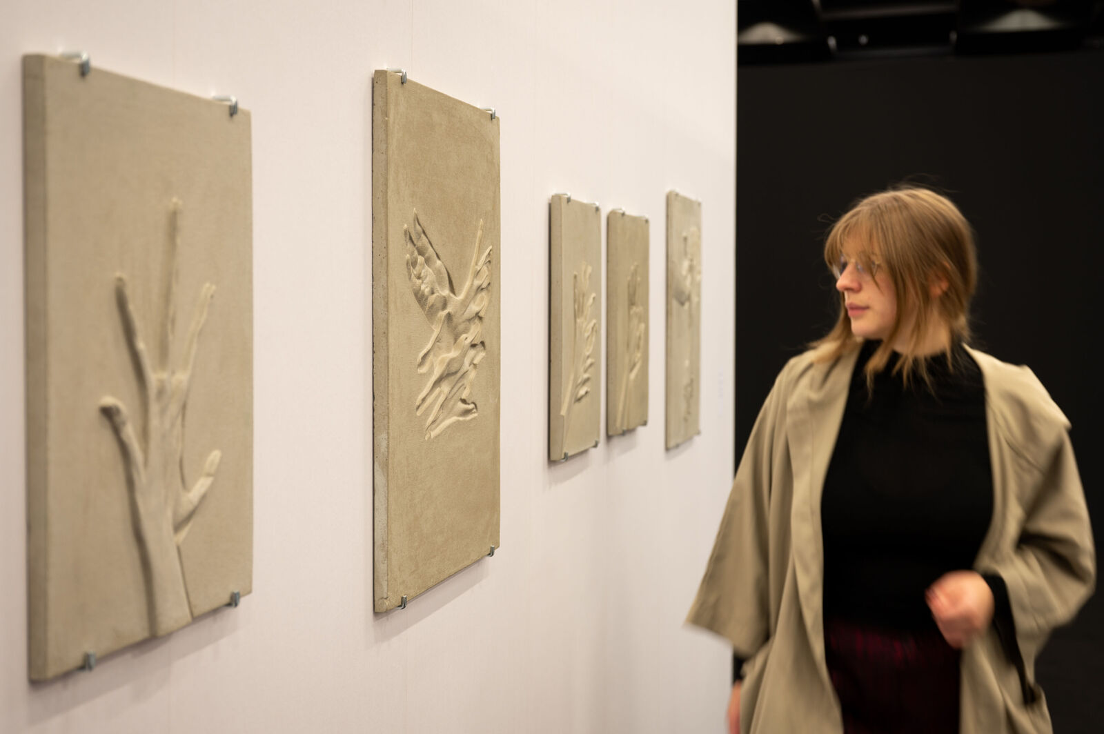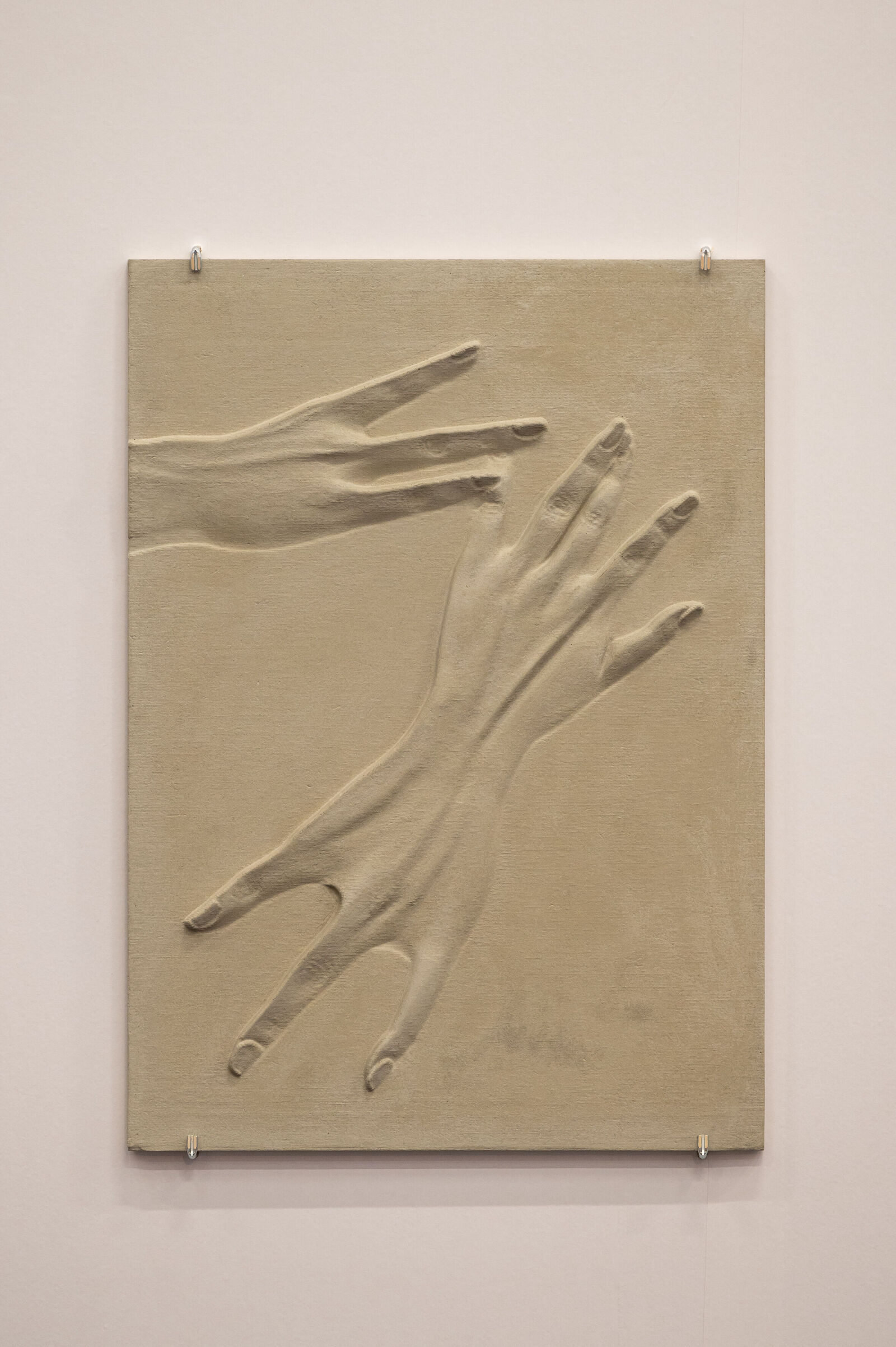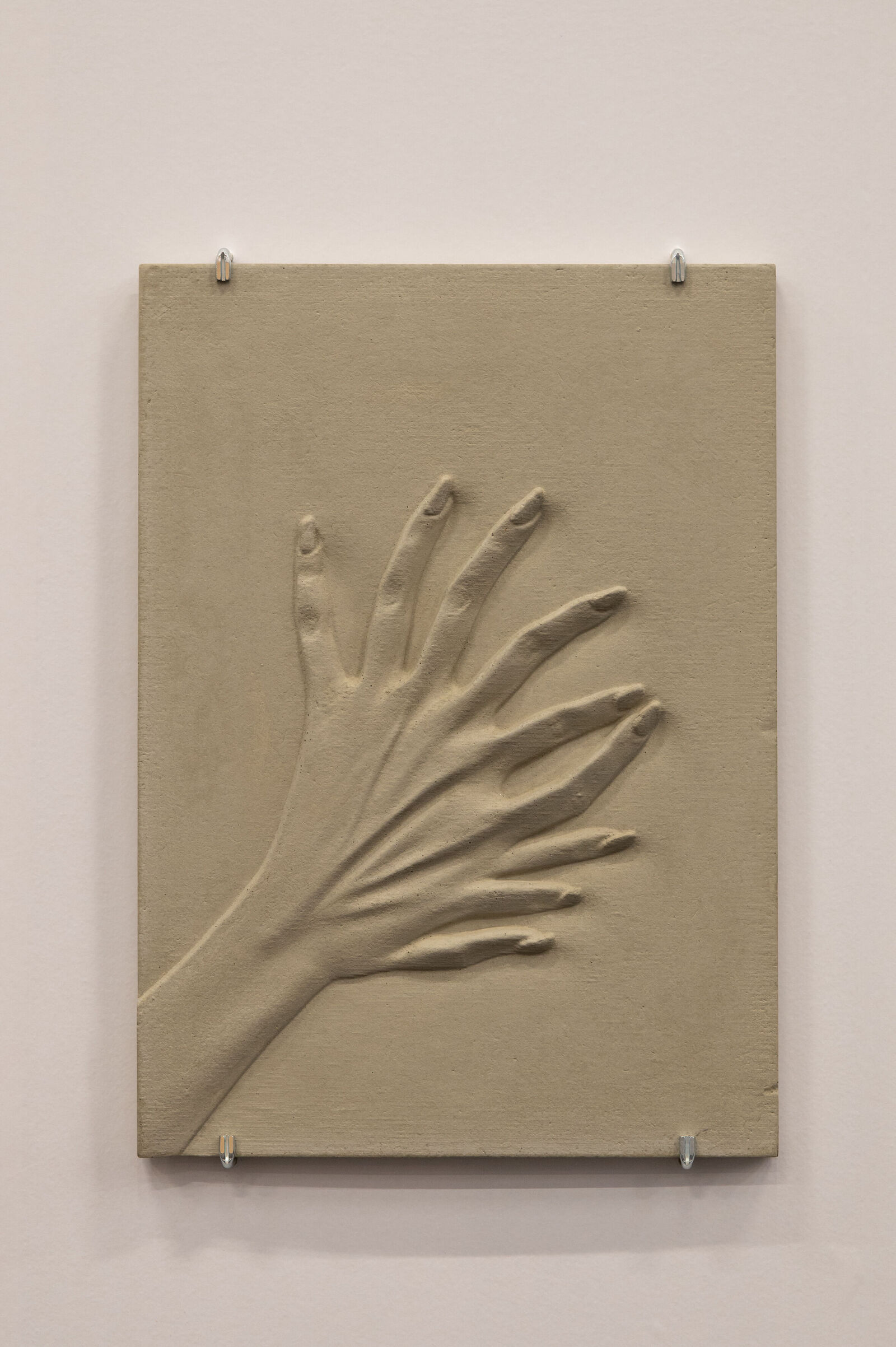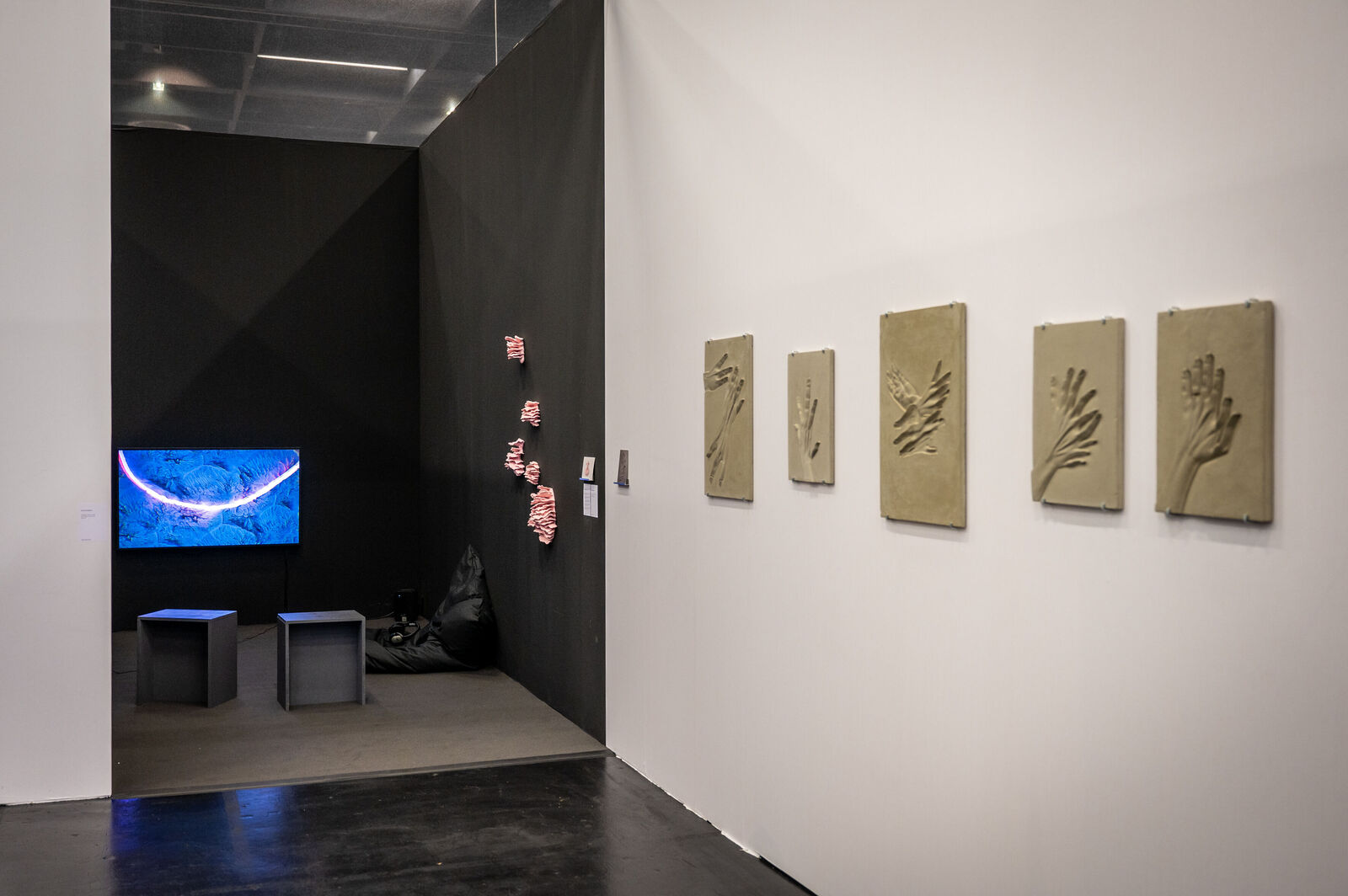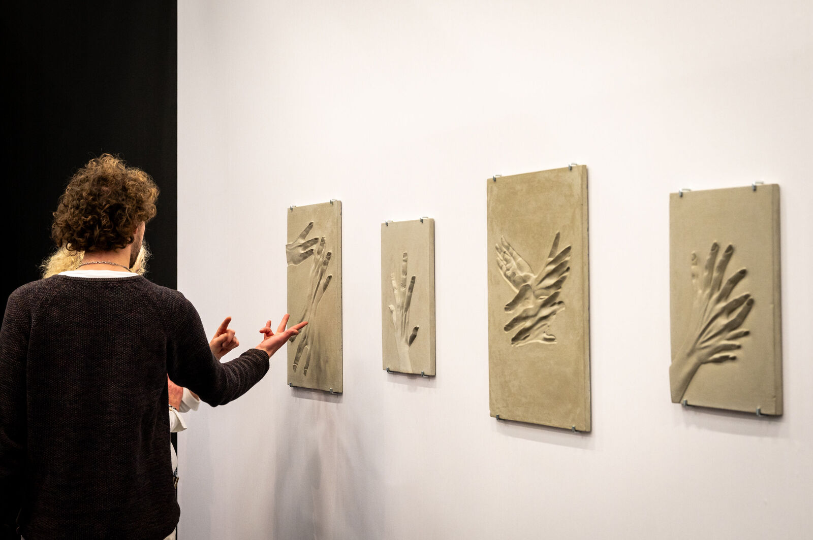 Kristina Lenz & Alex Simon Klug widmen sich in ihrem Werkkomplex "unsolid ground" (2023) mit archäologischem Blick den KI-basierten Werkzeugen an Bildgeneratoren, die durch die Eingabe von Textbefehlen Bilder generieren können. Als Ausgangspunkt fungiert das sogenannte „Handproblem“, bei dem die falsche Darstellung von Händen als Erkennungsmerkmal für generierte Bilder diente. Dieses frühe Stadium der naiven Freiheit einer wachsenden „Intelligenz“ fangen die beiden Künstler*innen als Fossil einer sich rasch entwickelnden Technologie in Beton gegossenen Artefakten ein.