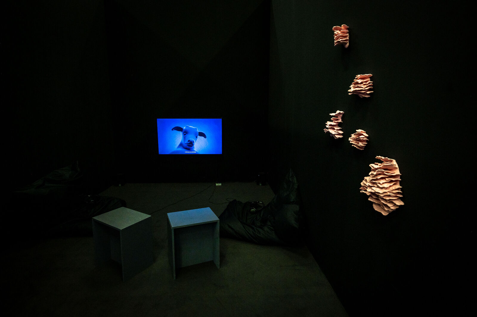 In Nathan Schönewolfs Werkgruppe "like everything else, I will lose you eventually" (2022) dienen ebensolche Zwischenwesen, die in hybriden Entstehungsprozessen entstanden sind, als Mittler*innen für eine Auseinandersetzung mit Affekten. Eine Videoinstallation nimmt uns mit auf einen Weg gemeinsam erlebter Erschöpfung und der Aufarbeitung von Ereignissen in einer lebensfeindlichen Umgebung.