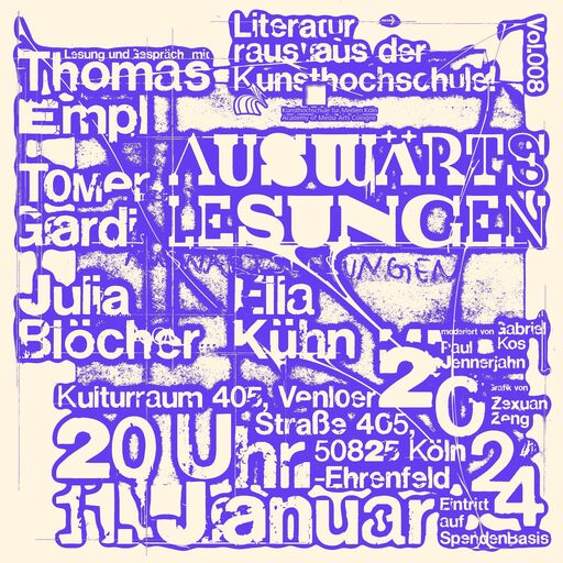 Von Paul Jennerjahn und Julie Sophia Schöttner initiiert, kuratiert und moderiert, begrüßen die Auswärtslesungen zum Wintersemester 2023/24 auch Gabriel Kos, Yohan Holtkamp und Lisa James im Team.