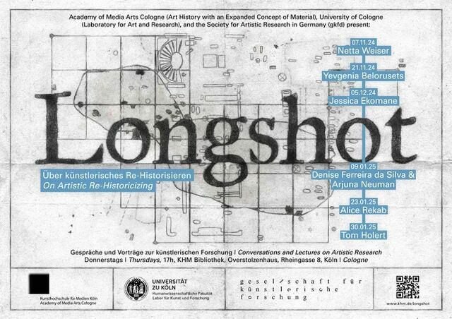 Longshot – Gespräche und Vorträge zur künstlerischen Forschung – präsentiert von der Kunsthochschule für Medien (Kunstgeschichte mit erweitertem Materialbegriff), Universität zu Köln (Labor für Kunst & Forschung) und Gesellschaft für Künstlerische Forschung in Deutschland (gfkd).