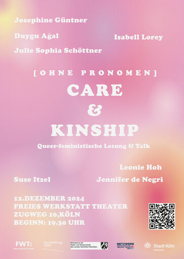Care & Kinship durchziehen die Texte unserer Autor*innen Duygu Ağal, Josephine Güntner und Julie Sophia Schöttner. Mit unserem Talkgast Isabell Lorey wollen wir das Thema vertiefen und queeren: Wie kann Sorge trans_formiert und jenseits von heteronormativer Zweigeschlechtlichkeit gedacht und praktiziert werden?