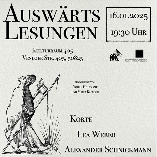 Auswärtslesungen – das ist eine Lesereihe von KHM-Studierenden des Literarischen Schreibens. Wir möchten aus der Institution Kunsthochschule heraustreten und rein in die Stadt, eine gemeinsame Bühne schaffen und Austausch finden, Texte miteinander teilen, lesen, zuhören, diskutieren. Zu jeder Veranstaltung laden die Auswärtslesungen Studierende der KHM sowie eine*n weitere*n Autor*in aus dem Raum Köln zu Lesung und Gespräch ein.
