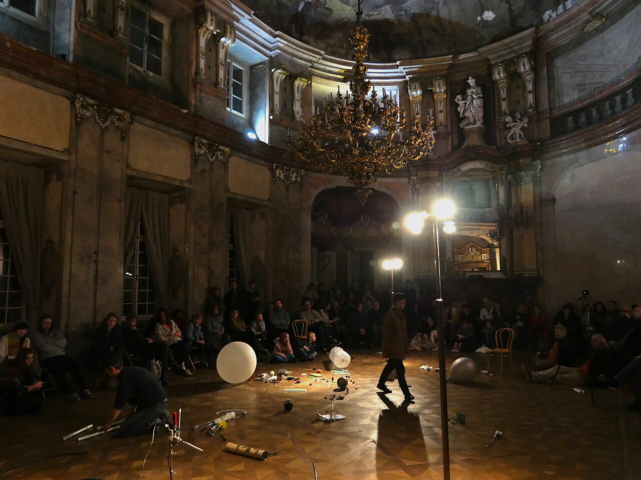 RN und PB haben verschiedene Methoden entwickelt, um Dinge in Schwingung zu versetzen, so dass ihre akustischen Schatten herumtanzen: unsichtbare Luftvolumen, die sich ständig neu formen, sich im Raum bewegen, in die geheimsten Orte und in uns selbst eindringen. Eine Möglichkeit, den Dingen näher zu kommen, ist, ihnen zuzuhören. Schließlich ermutigt man sie, mit verschiedenen Mitteln Klänge zu erzeugen und in Resonanz zu treten: zu schlagen, zu streicheln, zu schütteln, zu schlagen, zu schaben, zu kratzen, zu krallen, zu kochen, zu klatschen, zu rasseln, zu schaukeln, zu werfen, zu bewegen, zu magnetisieren, zu klammern, zu kochen, zu kneifen, zu galvanisieren, zu motorisieren, zu beugen, zu blasen, zu zu zupfen, zu erhitzen, fließen zu lassen, zu frieren, zu tropfen, zu tropfen, zu verbinden, zu rollen, zu mischen, zu dehnen, zu singen...