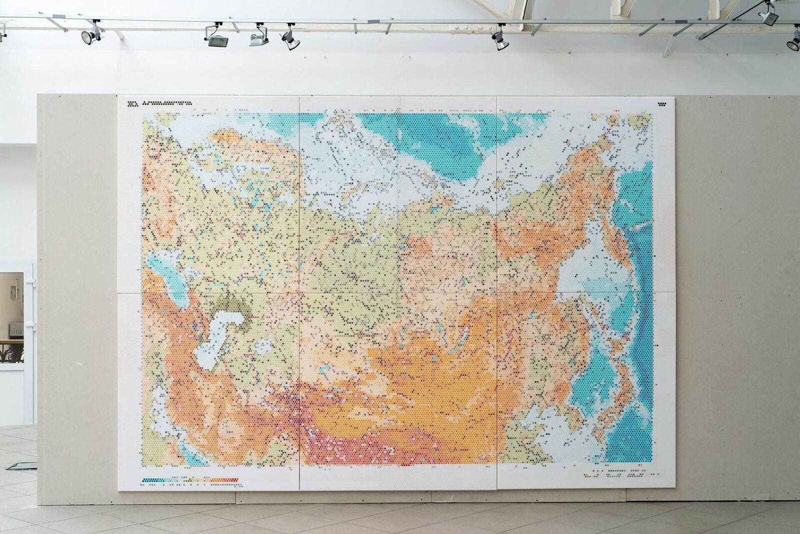 Die Hauptidee des Projekts besteht darin, die allgemein akzeptierten Konventionen des Formats zu zerstören und damit die grundsätzliche Konventionalität geopolitischer Prozesse zu bekräftigen. Durch das System von Elementen zeige ich ein Bild, das formal eine Karte der ehemaligen Sowjetunion darstellt, in der Praxis jedoch keine Karte ist, da sie nicht wie eine Karte gelesen werden kann: Es ist unmöglich, die Grenzen der ehemaligen Republiken zu erkennen, ihre Maßstäbe zu überprüfen oder ihre geografische Lage eindeutig zu bestimmen.