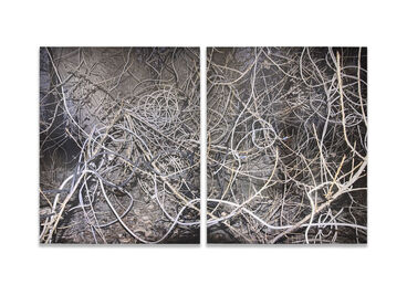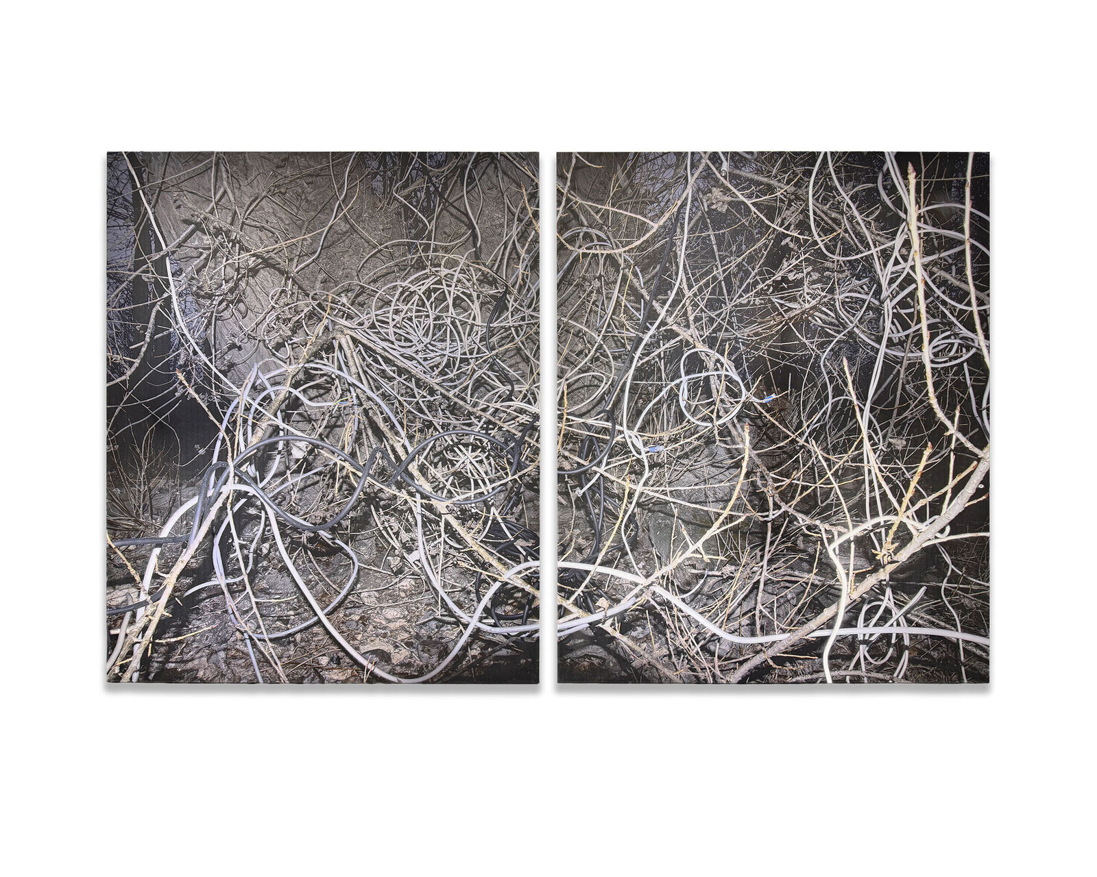 Oberfläche. Die Arbeiten basieren auf fotografischen Installationen, die in natürlichen Umgebungen entstehen und Kabel als zentrales Material nutzen, von Internetkabeln über Audiokabel bis hin zu Stromkabeln.