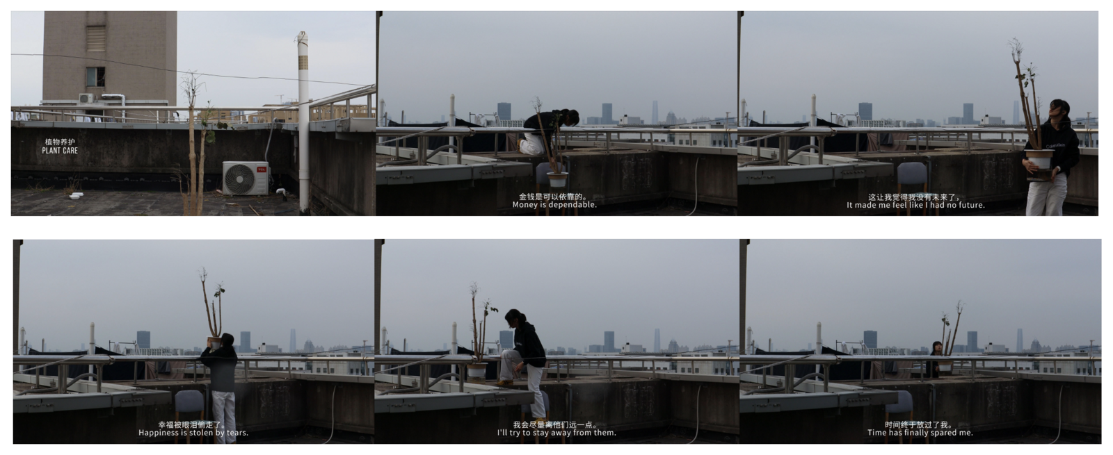 Das Projekt „Rooftop Performance“ umfasst zwei Videoinstallationen, die Performances dokumentieren, die auf dem Dach desselben Gebäudes aufgeführt wurden. Dieses alternde Gebäude in Wuhan, China, ist ein schwach beleuchteter, überfüllter und komplexer Ort, an dem sich junge Menschen mit bescheidenen Mitteln zum Vergnügen und Konsum versammeln. Für die Künstlerin stellt der Dachraum ein faszinierendes und komplexes Terrain dar – gleichzeitig öffentlich und privat, verborgen und doch gefährlich. Obwohl er sich innerhalb der Skyline der Stadt befindet, verbirgt er allerlei Schmutz und Geheimnisse. Die Dachperformance ist die Antwort der Künstlerin auf die soziale Notlage asiatischer Frauen. Durch Aktionen wie Fotografie, Inszenierung und Kostümwechsel verwandelt sich die Künstlerin von ihrer Identität als Künstlerin in ein mehrdeutiges Porträt einer asiatischen Frau. Indem sie ihr Privatleben offenlegt, kritisiert sie die Lebensumstände asiatischer Frauen, denen es an echter Unterstützung, authentischem Privatraum und stabilem Privateigentum mangelt. Die Interaktion mit der verlassenen Pflanze auf dem Dach konzentriert sich auf Fragen der Armut und Sicherheit von Frauen. Eine Frau, die auf tragische Weise entführt und missbraucht worden war, wandte sich einmal mit den Worten an die Kamera: „Diese Welt will mich nicht mehr.“ Als die Künstlerin diese sterbende Pflanze sah, erinnerte sie sich sofort an diese Worte. Indem sie die Pflanze aus einer versteckten Ecke an den höchsten Punkt des Daches versetzte und durch ein Collagen-Gedicht aus Selbstmordbriefen verschiedener Frauen innerhalb des Werks, wird die Pflanze mit einer starken Neigung erfüllt – entweder zur Befreiung von ihren Fesseln oder zur Selbstzerstörung.