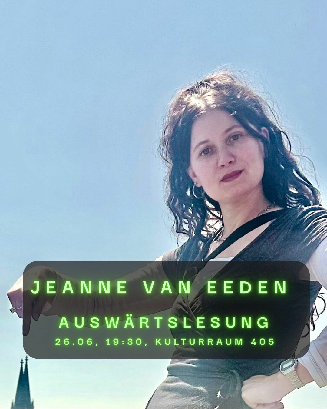 Jeanne van Eeden wod 94 en Kölle am Rhing jebore. Domet muß se jetz levve. Nach bereits diversen Studien der Geisteswissenschaft, hat Jeanne das nächste Studium in Köln begonnen – an der KHM. Mit Schwerpunkten in Videokunst und literarischem Schreiben befasst sie sich in ihrer künstlerischen Arbeit mit unsichtbaren Transaktionen und nimmt es durch verschiedene Medien mit der Spurensuche auf. Dabei kommt der Dokumentation von Innerlichkeit eine besondere Bedeutung zu: jedem Nachdenken über Welt geht eine Berührung mit ihr voraus. Wer Inneres verfolgt, gelangt zum Äußersten. Jeanne nennt das Kunst, andere Paranoia. Kölle Alaaf.